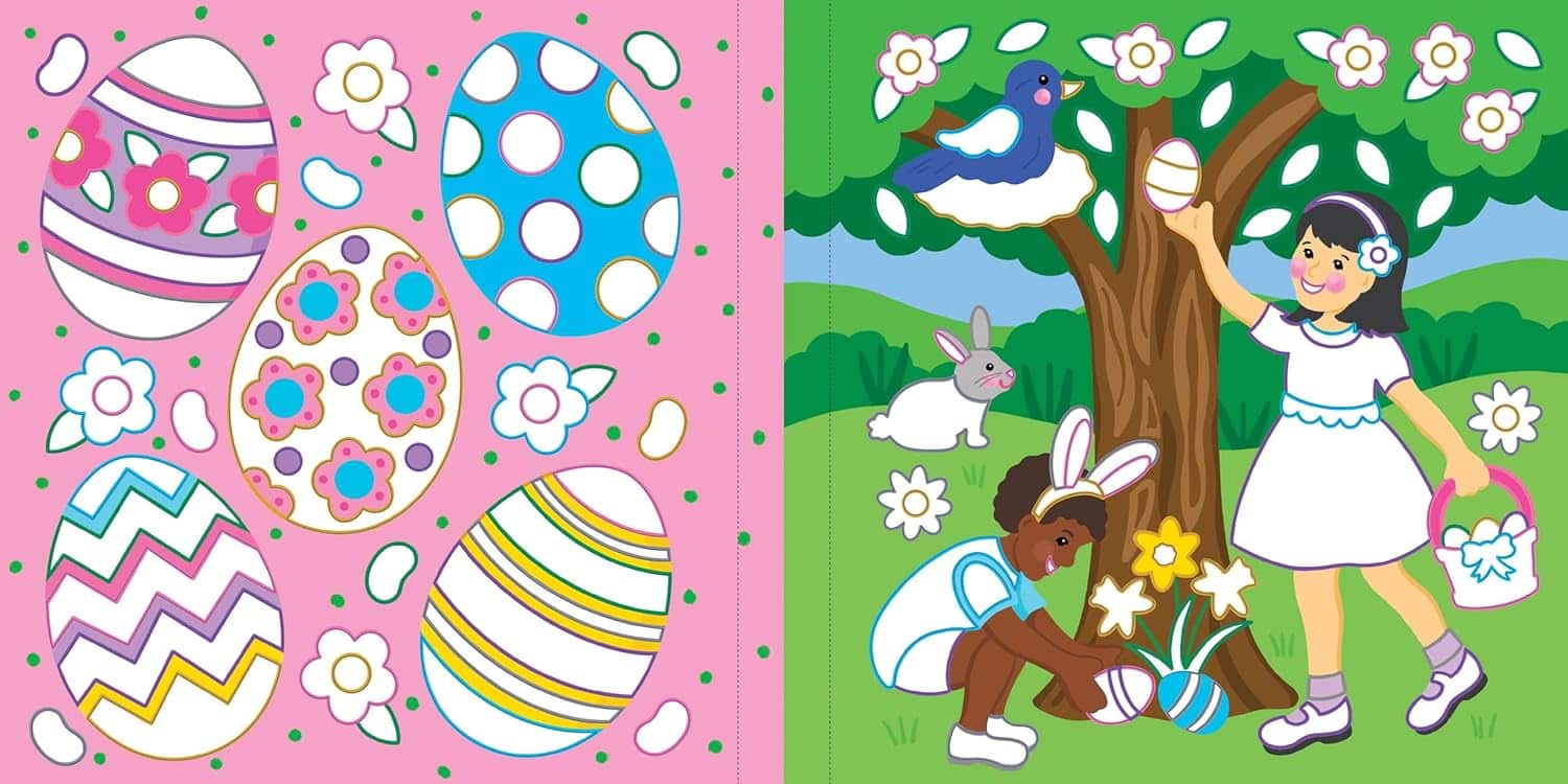 Create 10 shimmering Easter pictures with shiny holographic foil! Delightful activity book is designed especially for young children. Features 10 fun scenes to complete with the sparkly foil sheets included. Simply place foil on the sticky areas in each scene, press, and wow! Pictures include Easter bunnies, egg hunts, little lambs, chicks, and more! Picture pages are perforated for easy removal and display. 10 simple art activities are perfect for little hands. Helps develop fine motor skills through creative play. Activity book comes with 18 shiny foil sheets in 6 brilliant colors! Mess-free creative fun at home or on the go! Activity book has 10 pages plus 18 sheets of foil. Sturdy card-stock binding. Foil activity book measures 8-1/2'' square. Suitable for ages 3 and up. Let the color-by-foil fun begin!