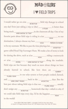 With 21 “fill-in-the-blank” stories about the fun and frenzy of class trips, there’s plenty of laughs to pass the time. Play alone, in a group, or on the way home from your adventures. Mad Libs are a fun family activity recommended for ages 8 to NUMBER.