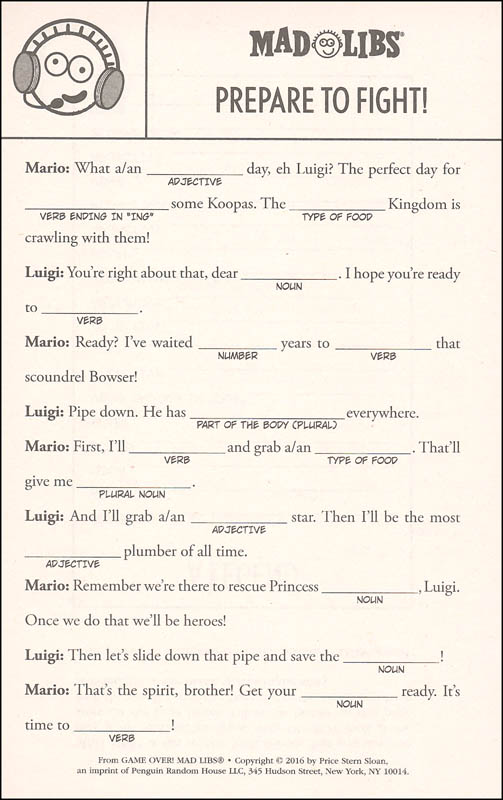 Game Over! Mad Libs features 21 hilarious and over-the-top stories all about gaming. Whether you're an Xbox junkie, a Wii Sports expert, or a Minecraft addict, there's something for every kid (and adult!) gamer inside this book. Grab a bag of chips and your favorite bean bag chairit's time to jump into the world of video games, Mad Libs style!