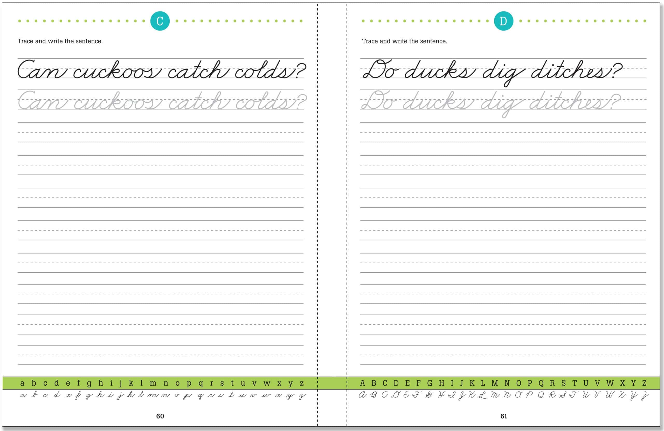 This fun workbook can help kids teach themselves how to write in cursive (also known as longhand or script) or allow them to refine the writing skills they already have. This book includes: Pages of capital and lowercase letters. Follow-the-arrow diagrams that show how to make the letters. Words to copy that begin with all the letters of the alphabet. Sentences to copy. Guides for writing the names of months, the days of the week, and numbers from 1 to 10. A place for the child to write his or her signature. Appealing full-color pictures. With its helpful diagrams, plenty of space to work, and simple exercises, this book is the perfect companion for beginning writers. 8-1/2 inches wide by 11 inches high (21.6 cm wide by 28 cm high). 96 perforated and reproducible pages. Studies have shown that writing is an excellent way to activate different parts of the brain. Learning how to write helps children develop fine motor skills. Writing things down also helps them retain more information. Fewer and fewer schools are teaching cursive these days and parents are looking for resources like this for their children. Many kids, too, want to write like their parents and grandparents. This book will help!