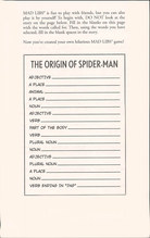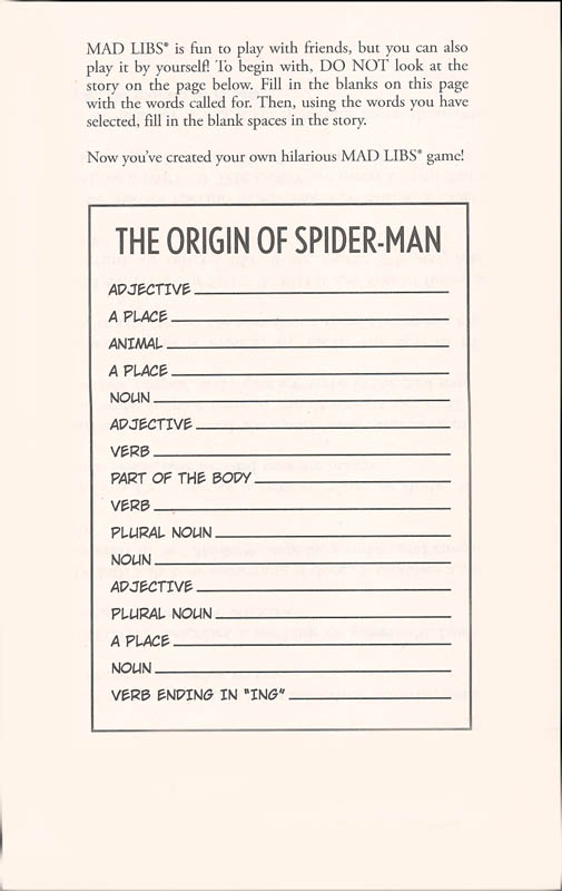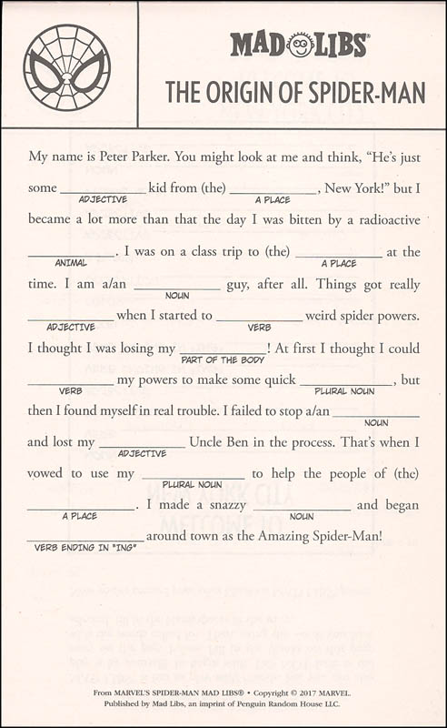 You don't have to be a superhero to enjoy filling in the blanks of the 21 stories inside this book starring Your Friendly Neighborhood Spider-Man!