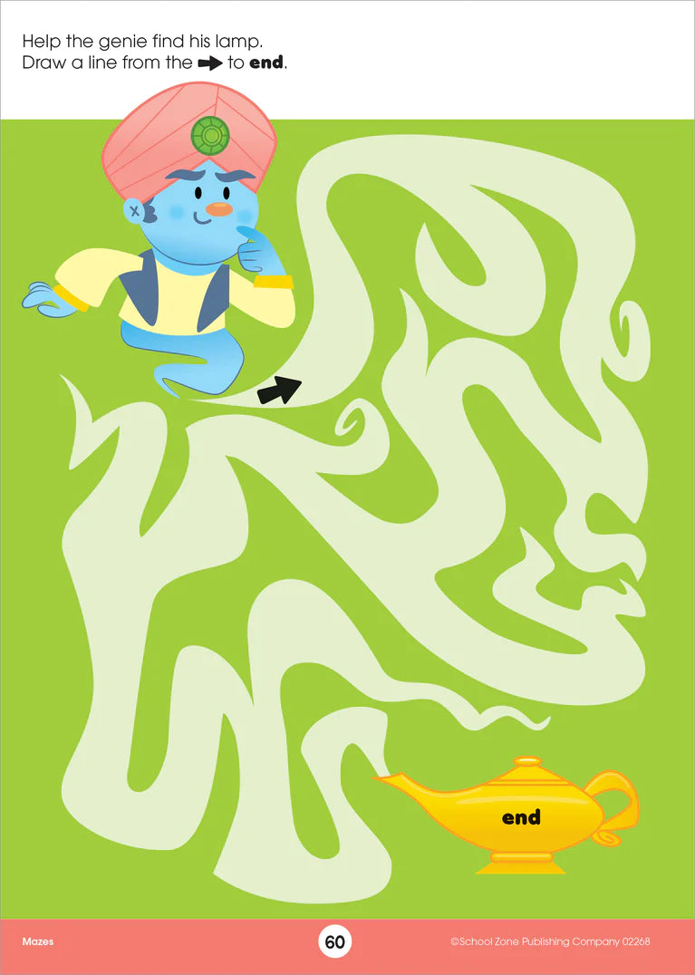 Getting from here to there can develop an amazing number of skills. Mazes boost focus, reasoning, problem-solving, and eye-hand coordination. Kids love them, and School Zone’s are some of the best! This workbook from the Get Ready!™ series is full of mazes with a helping mission. They use both familiar fairytale characters and everyday situations as themes to draw kids in to lend a hand. Help Rapunzel find her hairbrush, the elf find her way through the meadow, or the baby dragon find his father. The paths start out easy for kids learning or trying to master pencil control and get more difficult as the book progresses. These playful scenes spark imagination too.