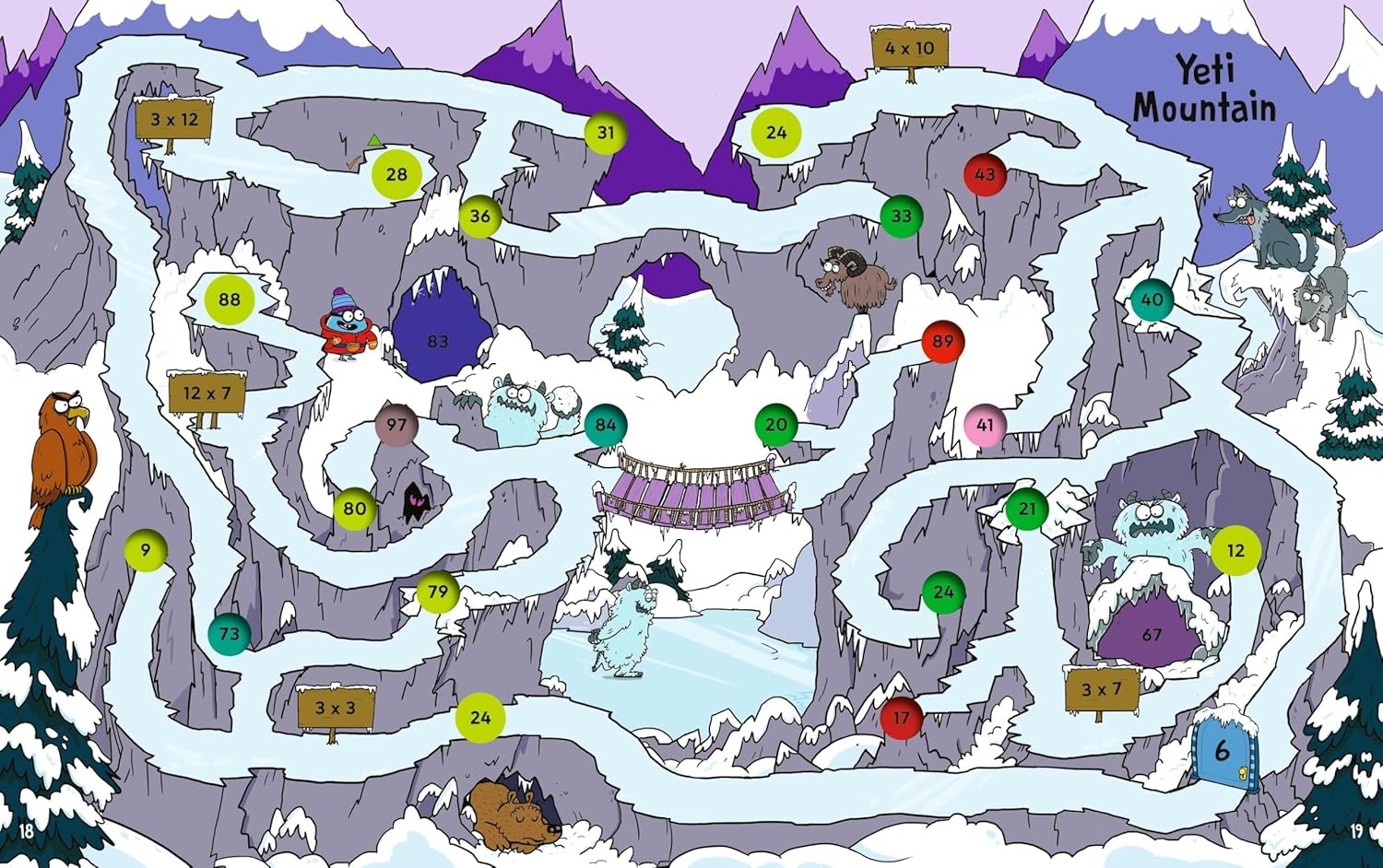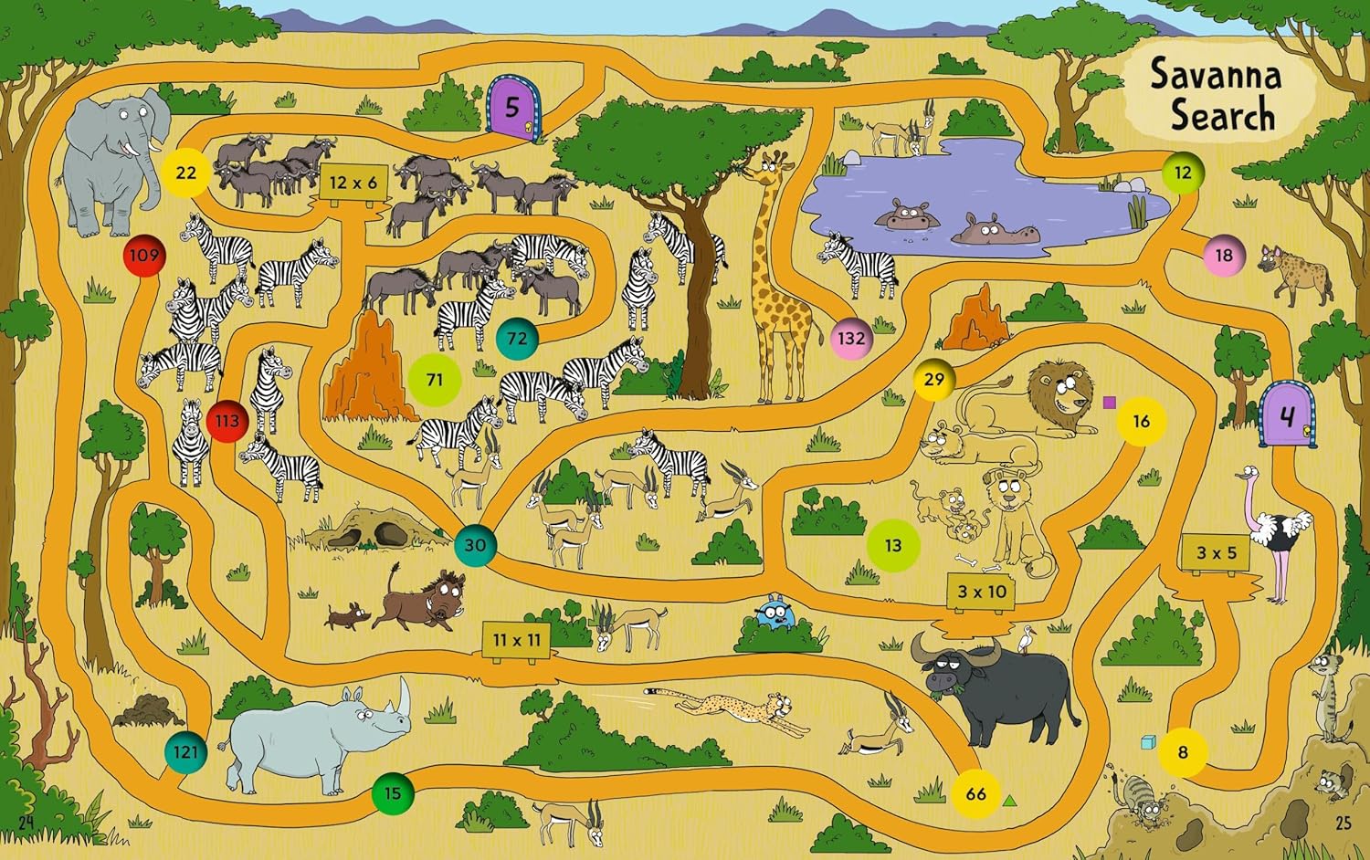 Readers explore a variety of maze worlds, solving multiplication facts and navigating pathways and portals through pages as they complete a quest to restore numbers to a multiplication chart. Mega Math Maze leads students through a jungle, up a mountain, into a cave, and through other adventurous terrains. To complete the quest and make their way through the book, students must solve multiplication facts and follow pathways to the right answers. And just when the adventurers complete their quest, they’re tasked with another quest to journey back through the maze via alternate paths using division and secret doors in search of a mystery sign.