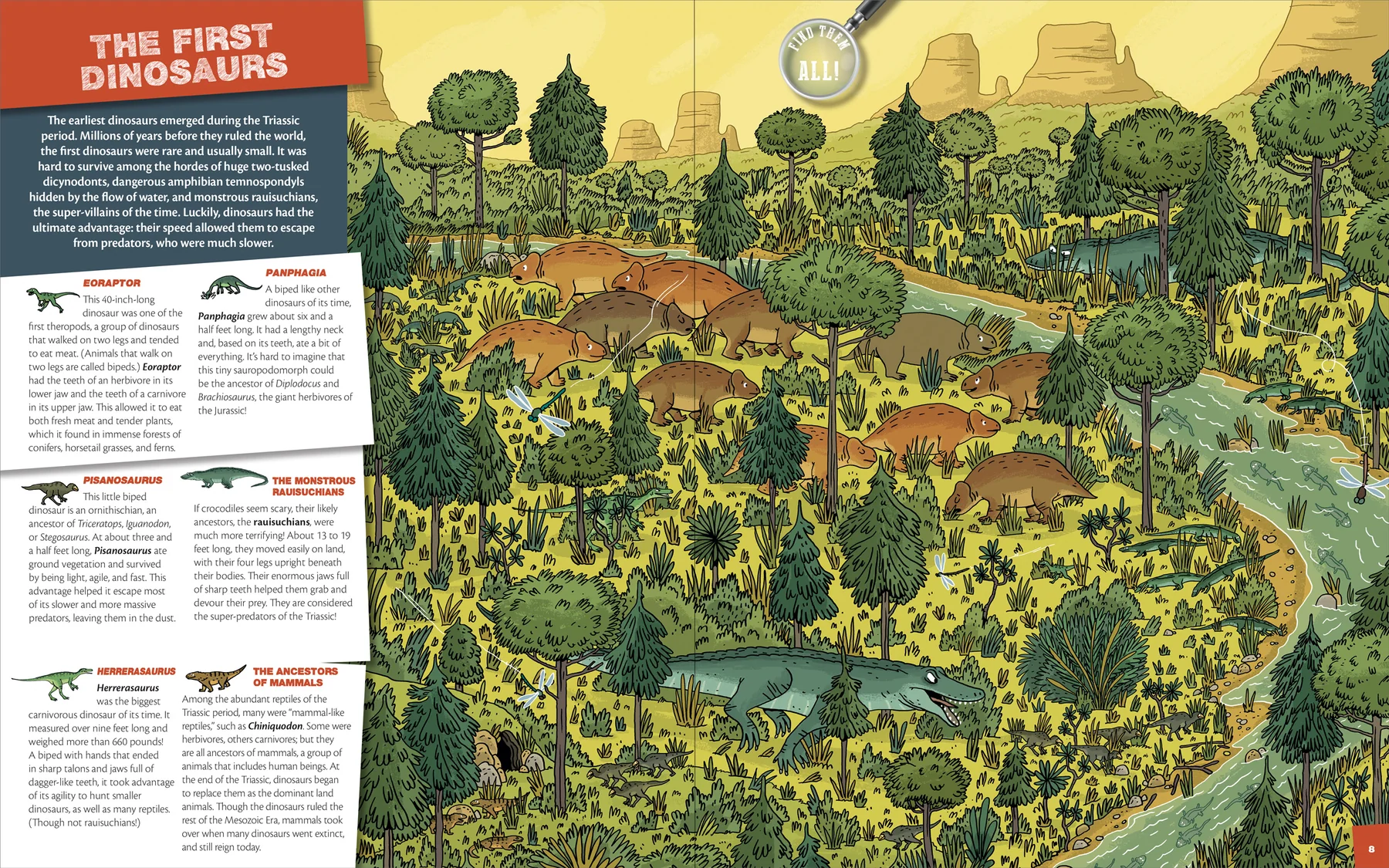 Take a trip back through time and find the hidden dinosaurs on each page!