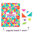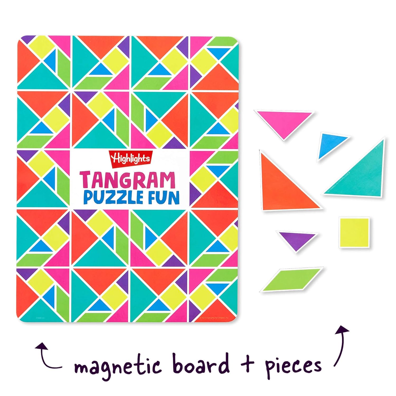 Puzzle play—it’s magnetic! With this unique activity set, kids can solve tangram puzzles again and again using the included magnetic board and pieces. Puzzlers ages 6 and up will enjoy the brain-teasing fun of solving each tangram, plus more engaging activities like Hidden Pictures scenes, logic puzzles and more. Tangram Puzzle Fun includes dozens of tangram puzzles with an included magnetic board and shape pieces. Arrange the pieces to form a larger picture! Tangrams are a unique way for kids to practice concentration and critical-thinking skills through play. The magnetic board and pieces let kids solve each tangram repeatedly for endless puzzle fun. The variety of activities in this book will keep puzzlers engaged screen-free for hours with an easily portable format that’s perfect for fun on the go. These puzzles will also help children improve spatial reasoning, establish good work habits and build self-confidence—all through play! Like all Highlights products, this activity set is created by childhood experts to bring kids meaningful benefits and maximum fun.