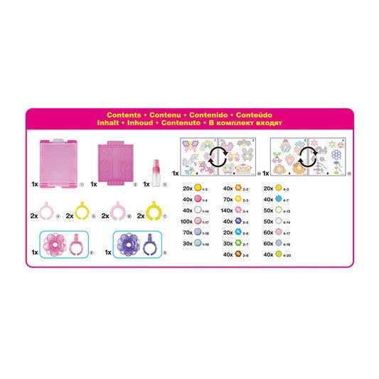 Design & Style Rings includes over 1000 solid, jewel, and star beads in 20 colors, 10 rings, flip tray set, sprayer, template sheets, and instructions.