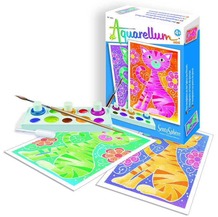 These easy to use sets feature a distinct and unique method that makes painting by numbers obsolete. The painter has complete control. Unique embossed picture cards absorb paint in some areas and repel it in others creating intricate, detailed works of art that even the youngest children can achieve. The vibrant colors provided in these superb painting kits are extremely appealing to children, Parents describe Aquarellum as captivating and relaxing for both themselves and their Children. The Mini Aquarellum were designed to introduce the now famous "Aquarellum" technique with a super low price! With three mixable colors, children can apply a delightful pallet of shades to their postcard size(2) paintings.