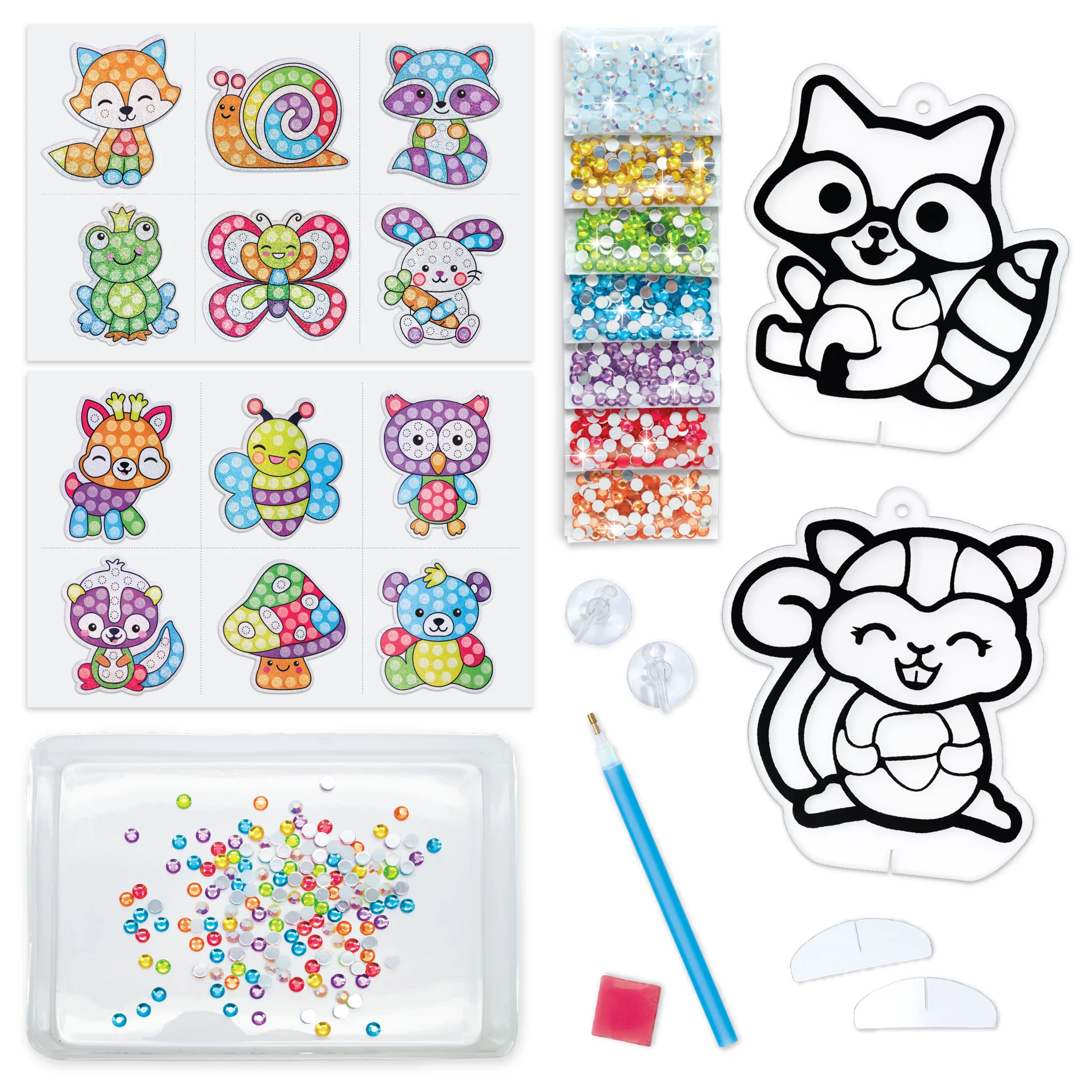 Enjoy two diamond painting activities inspired by our favorite woodland creatures with 12 holographic stickers with printed dots for guided gem placement and two sun catchers with an open-ended design for children to use their imagination.