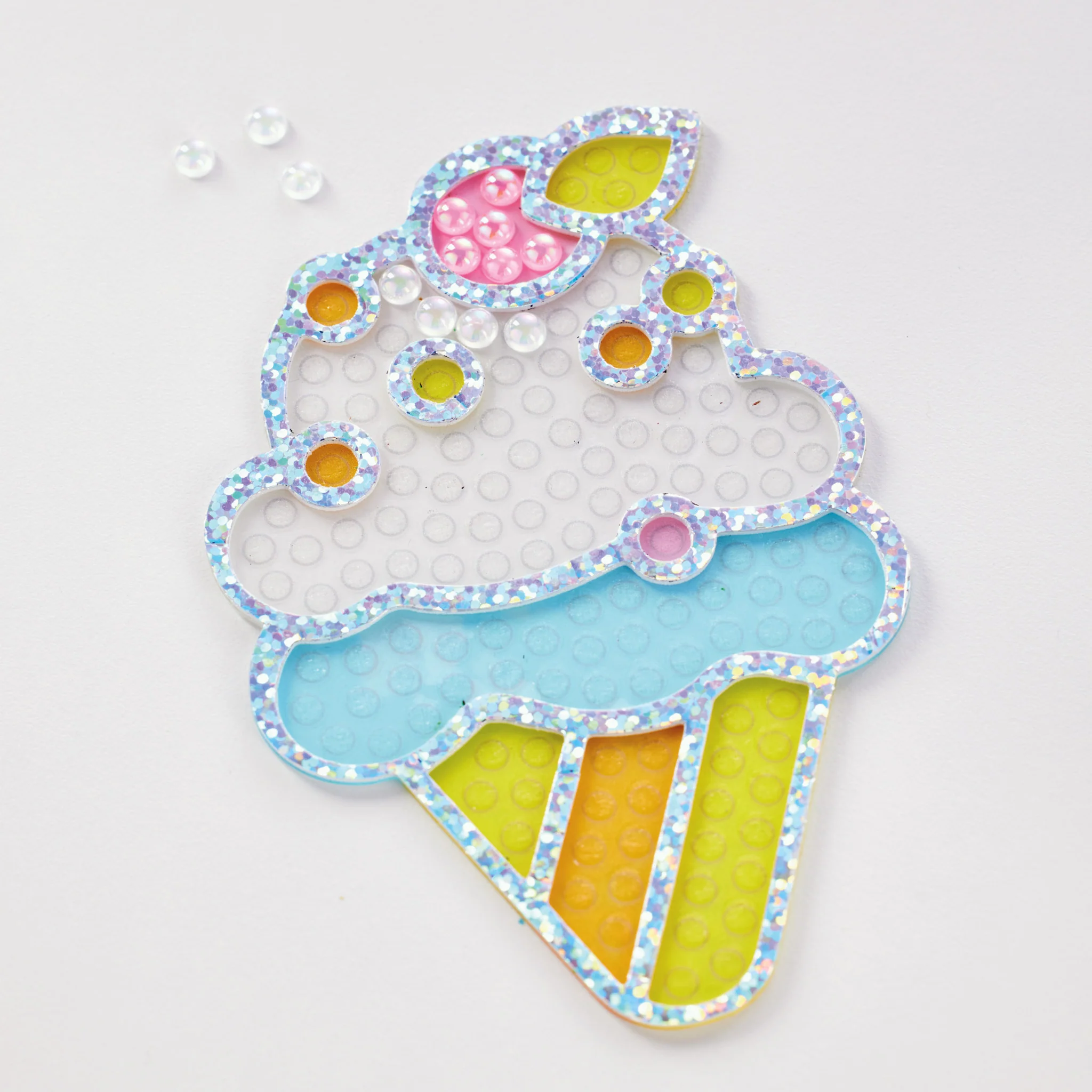 The super size ice cream foil sticker has a pre-printed color guide for kids to easily follow. With a no glue, no mess 2 step process: pick up and place, kids can create their own super sticker without difficulty. Pearlized bubble gems add depth and dimension for sticker art that pops!