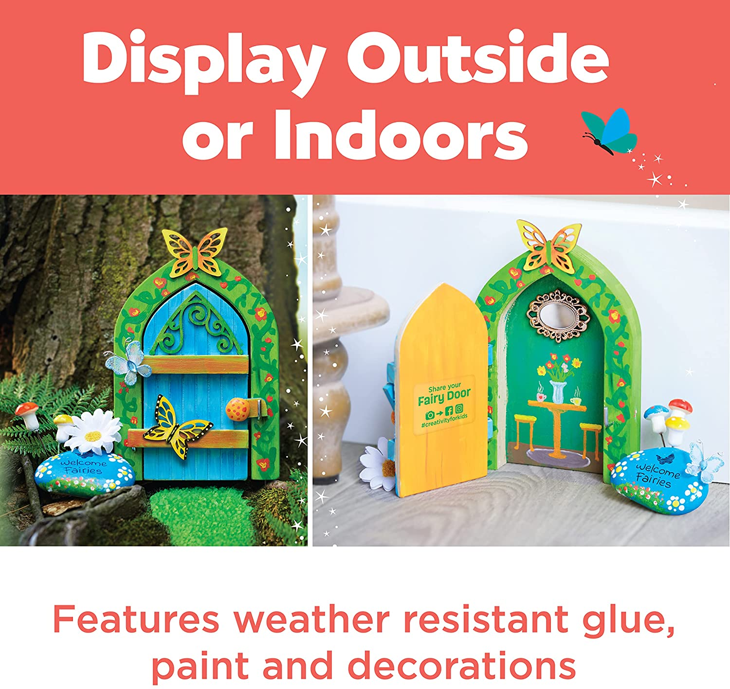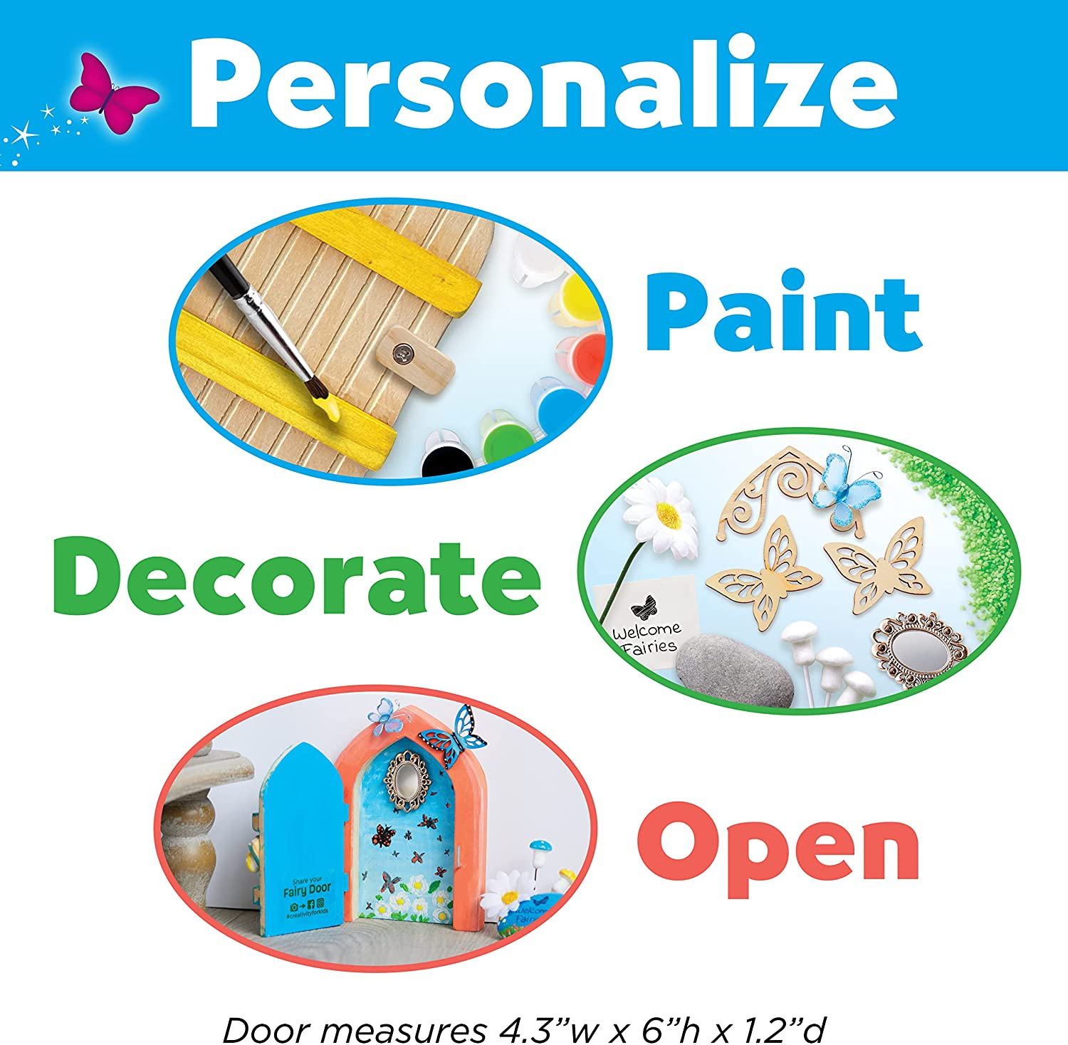 Add a dash of magic to your crafting activities by painting and decorating a fairy door with the Creativity for Kids Butterfly Fairy Door! Paint your own enchanted fairy door with weather resistant paint and a variety of fairy accessories such as a welcome rock for painting, gravel path, foam mushroom, tulle butterflies, faux flower and more! The beautiful wooden fairy door opens and closes to reveal a ready to decorate interior that you can personalize with paint, a mirror, and wooden accents. This fairy toy for girls and boys comes with everything you need to start crafting, just add imagination! The complete craft set for kids includes a wooden fairy door with hanging hook, 6 weather resistant paints, medium and fine tip paint brushes, wooden accents, adhesive backed plastic mirror, tulle butterfly, foam mushrooms, faux flower, fairy rock, rock transfer, gravel, waterproof glue, tracking sticker and illustrated instructions. Weather-resistant paint and glue allows the magical fairy door to be placed on a tree outside for you and your neighbors to enjoy! Explore the outdoors with a unique outdoor activity for kids! Place a tracking sticker inside your personalized fairy door so that when friends, neighbors and community members find the fairy door they can share it online! The Butterfly Fairy Door also makes a great addition to your room décor and can add a touch of whimsy to your wall or secret fairy hiding spot! The fun doesn’t end with the craft, kids will enjoy creative pretend play as they dream up magical stories about their fairy and fairy house for hours on end. Have fun while building creative confidence!