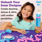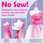 From the red-carpet runway to the Met Gala, glam is in! Featuring sparkle, rhinestones and ruffles, this newest Designed By You experience is geared towards special occasions and fancy celebrity event fashions. Featuring a modern mannequin, this "no pins, no sew" fashion experience is easier than ever. Just tuck the fabric into the mannequin or use the clips and sparkly belts to hold your designs in place.​ Complete experience includes a runway fashion backdrop, special occasion trims fabrics, sparkly belts, rhinestones, scissors and more.​ It's so easy to make clothes for your favorite dolls. Fabrics and trims can be used again and again for endless fashion fun! Ages: 6+