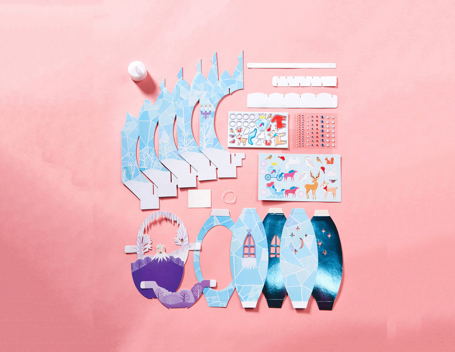 Lantern Lands is a paper-based DIY lantern with a magical scene inside! Slot the precut pieces together and decorate with punchouts, puffy stickers and gems. An LED tea light provides the glow. Customize this winter wonderland with whimsical character punchouts and stickers!