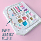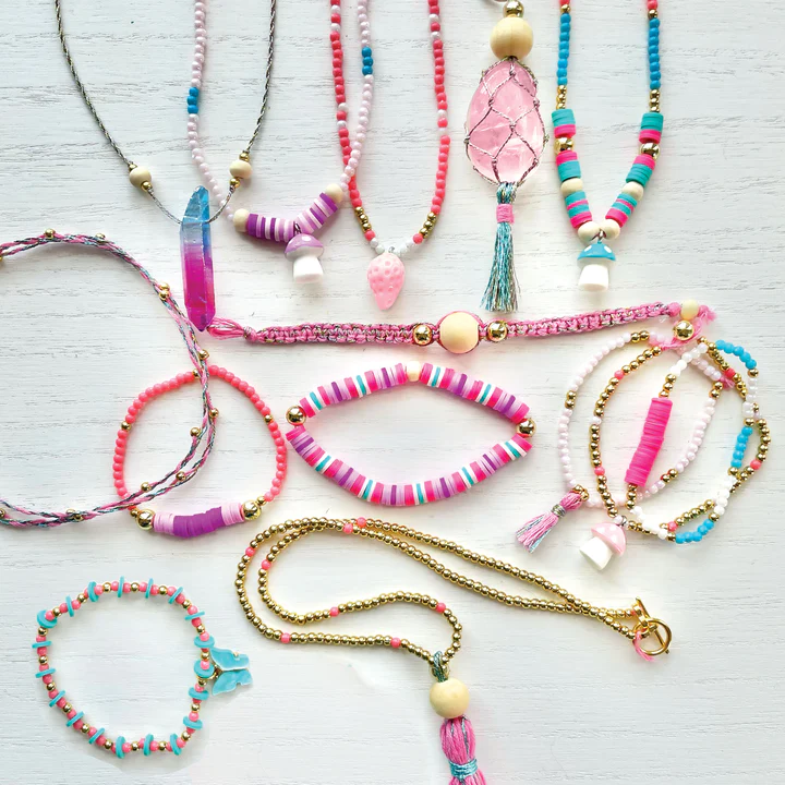 The Wish*Craft Mystical Jewelry Studio has beautiful heishi beads, real crystals, trendy mushroom, strawberry, and butterfly charms and more! Enough materials to make 20+ bracelets and necklaces. The instructions teach you different techniques. including how to make a macrame-crystal pendant! The tray has bead storage and a channel to design and measure your jewelry! Make beautiful jewelry that looks like you bought it in a boutique! A great set for kids 8+
