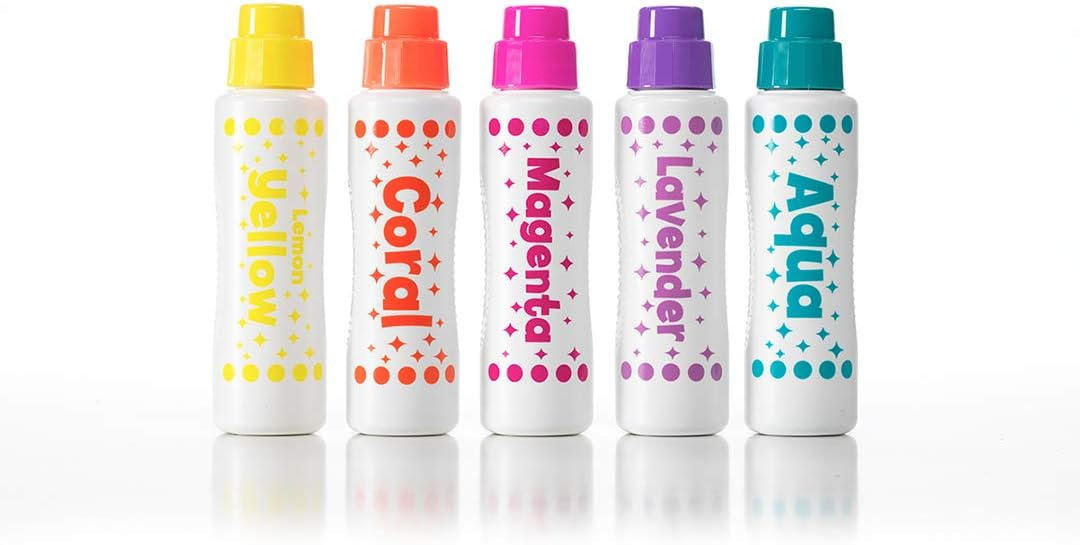 Do A Dot Art! Tutti Frutti Shimmer set comes with 5 WASHABLE markers. Each marker has a PATENEDED large sponge tip that will never dry out, and makes a perfect dot every time. Do A Dot Art! markers have bold pigments and bright colors that dry fast. Perfect for layering, blending, mixing colors, and covering a lot of space.