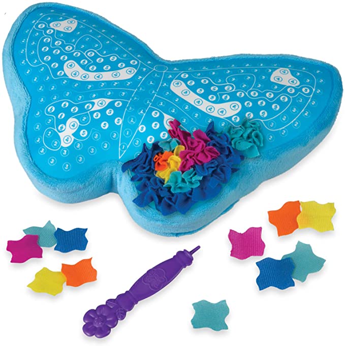 Make a fun and colorful pillow with these fabric-by-number kits (no sewing required). The pillow is pre-assembled, with numbered spots on the front. Use the color number legend to place the fabric pieces on the pillow, then press them in one at a time with the special tool. You will soon have a cute pillow covered with a rainbow of ruffled colors! Kit includes one small pillow, a tool to push fabric onto the pillow, and colorful fabric pieces.