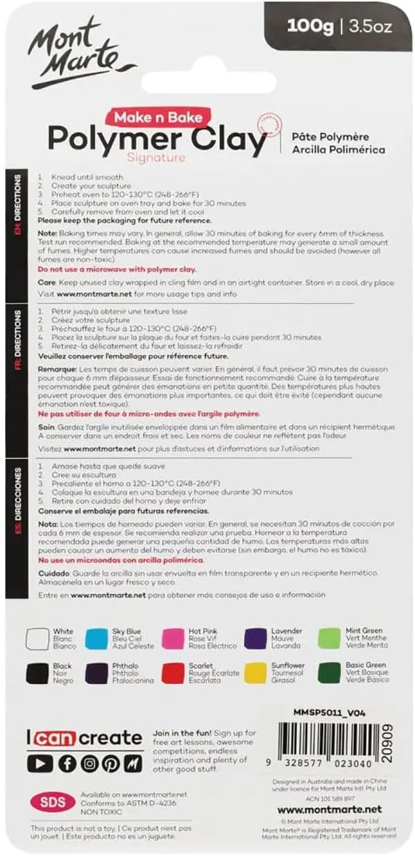 Mont Marte Make'n'Bake Polymer Clay is an easy to use, malleable non toxic synthetic clay that can be shaped then hardened in a standard household oven. It is ideal for use in press moulds, pattern making, figure and doll modelling, canes, beading, jewellery and many other sculptural projects.