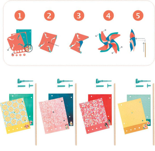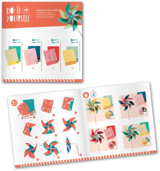 A creative kit for making 4 pastel-coloured windmills. Following the instructions, children can assemble, fold and attach the illustrated sheets onto the wooden rod to create beautiful windmills. When the wind blows, the mills turn and the colours blend, revealing new patterns.