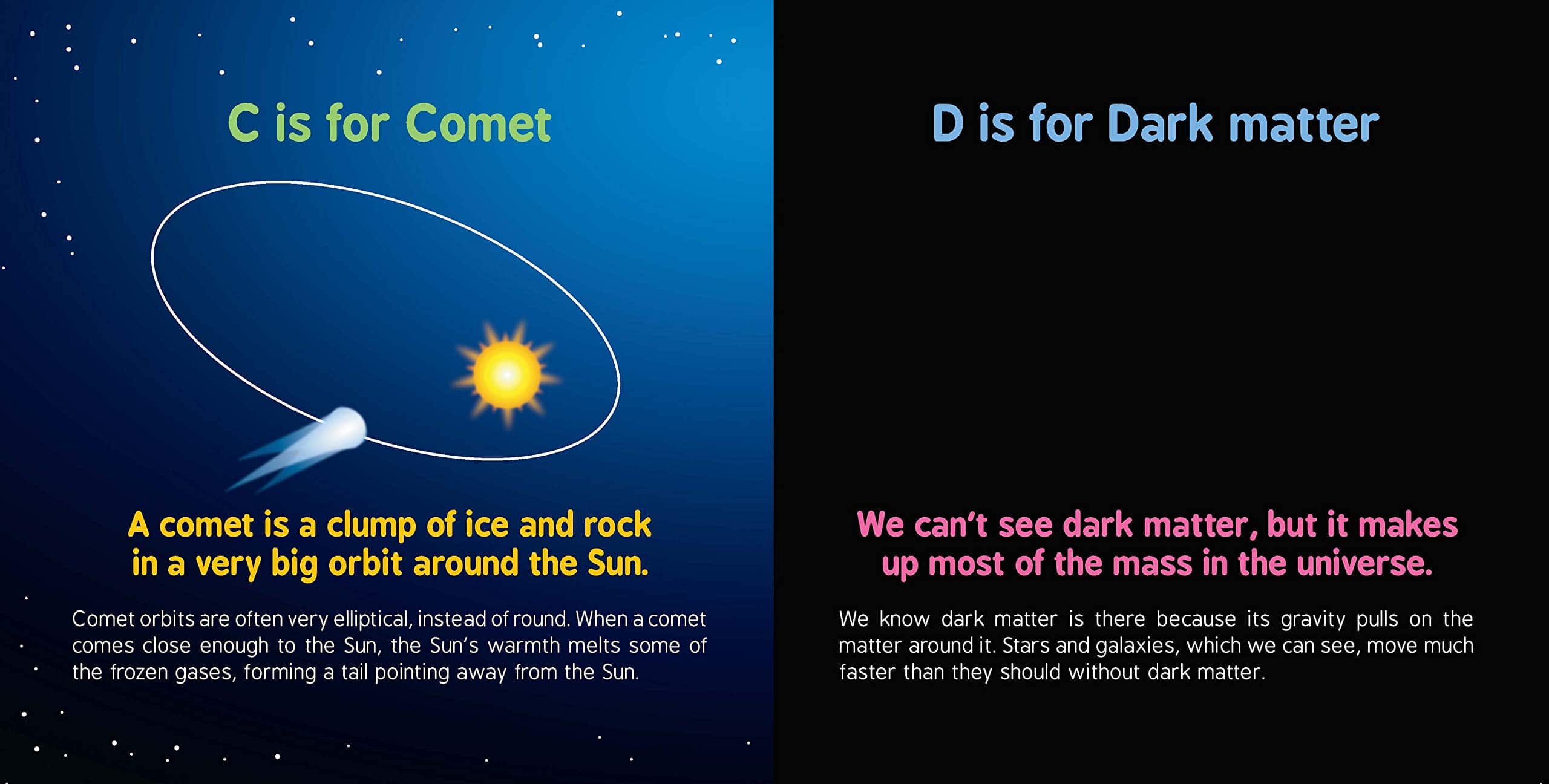 This alphabetical installment of the Baby University series is the perfect introduction for even the youngest astronomers! The ABCs of Space is a colorfully simple introduction for babies―and grownups―to a new astronomical concept for every letter of the alphabet. Written by an expert, each page in this cosmic primer features multiple levels of text so the book grows along with your little astronomer.