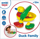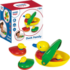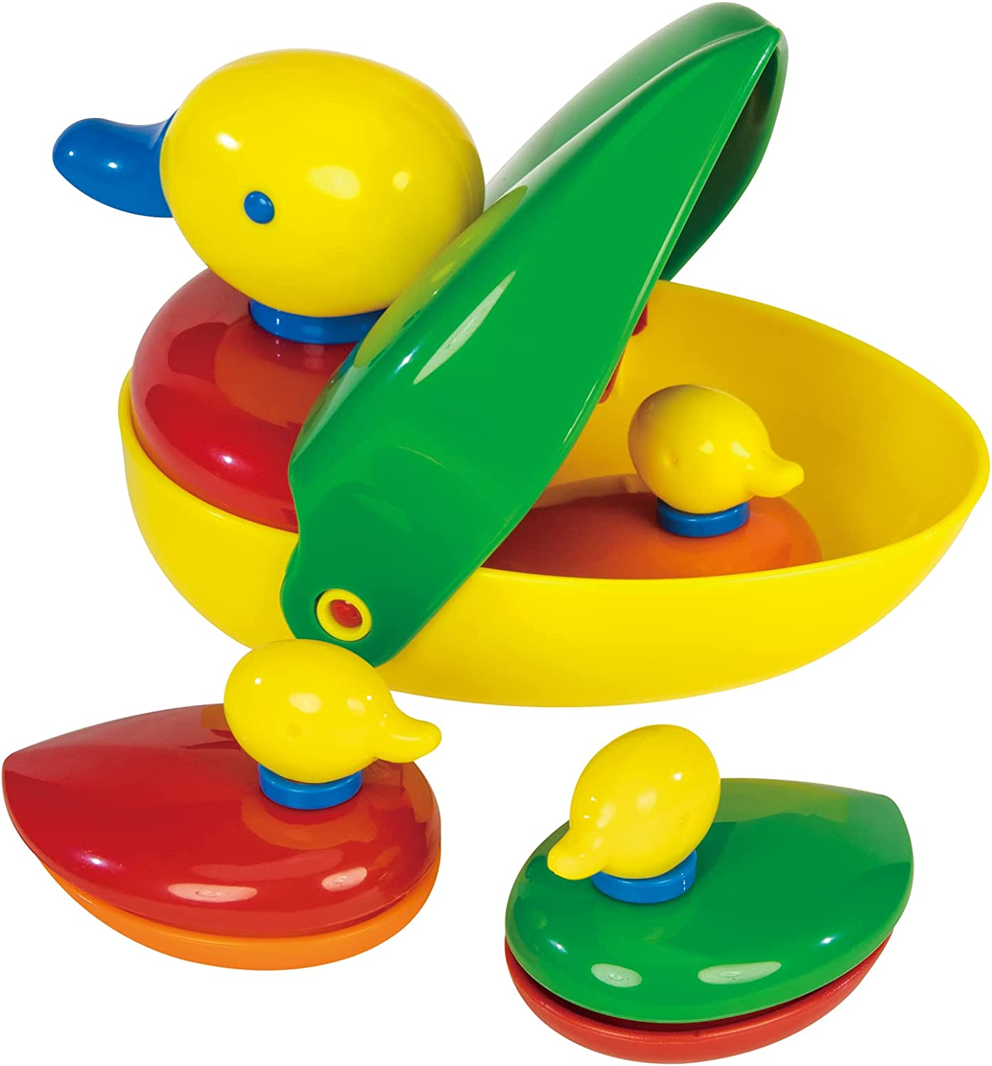 Three Little ducklings hide inside mother duck. The happy family swims together to delight a child at bath time.