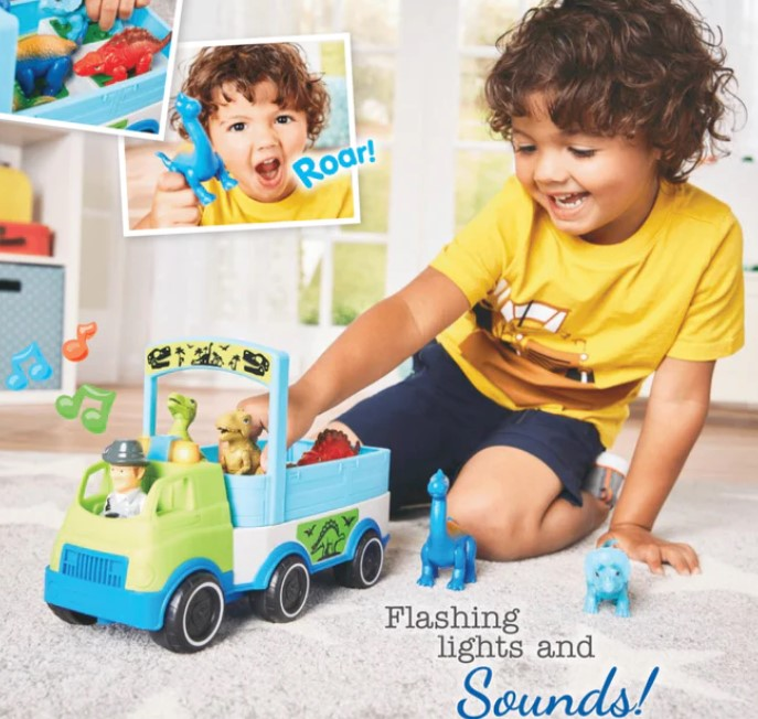 Interactive vehicle and Playset with light and sounds. 5 posable dinosaurs with unique sound effects when returned to the truck. Sound effects include engine rev, horn & music