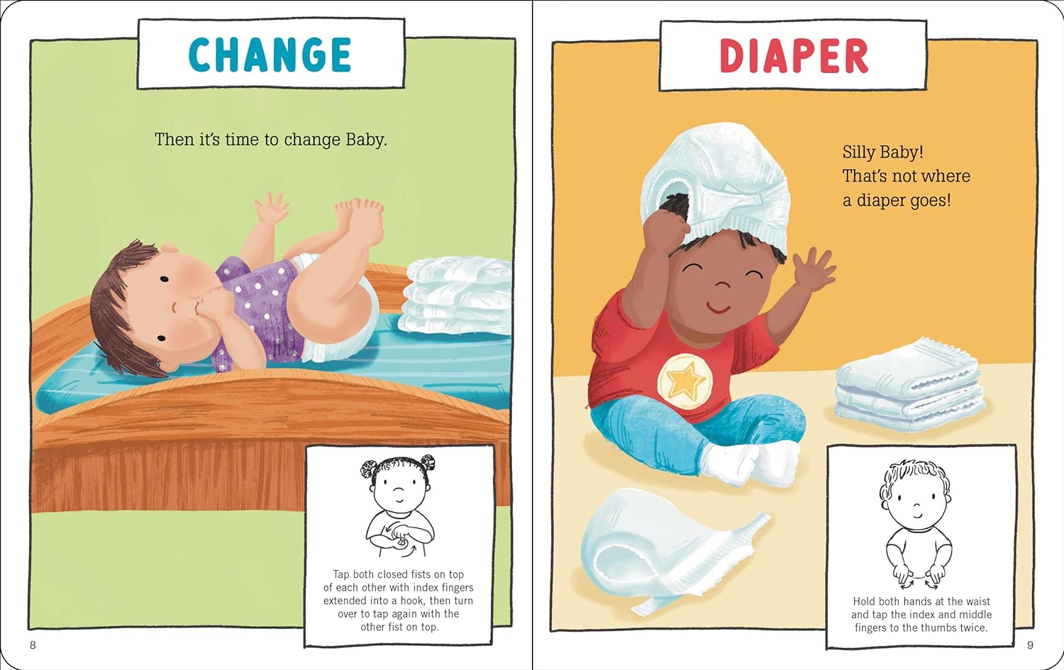 My First Baby Signs uses story to introduce over 40 key American Sign Language (ASL) signs and pairs them with visual and written guides on how to do each sign.