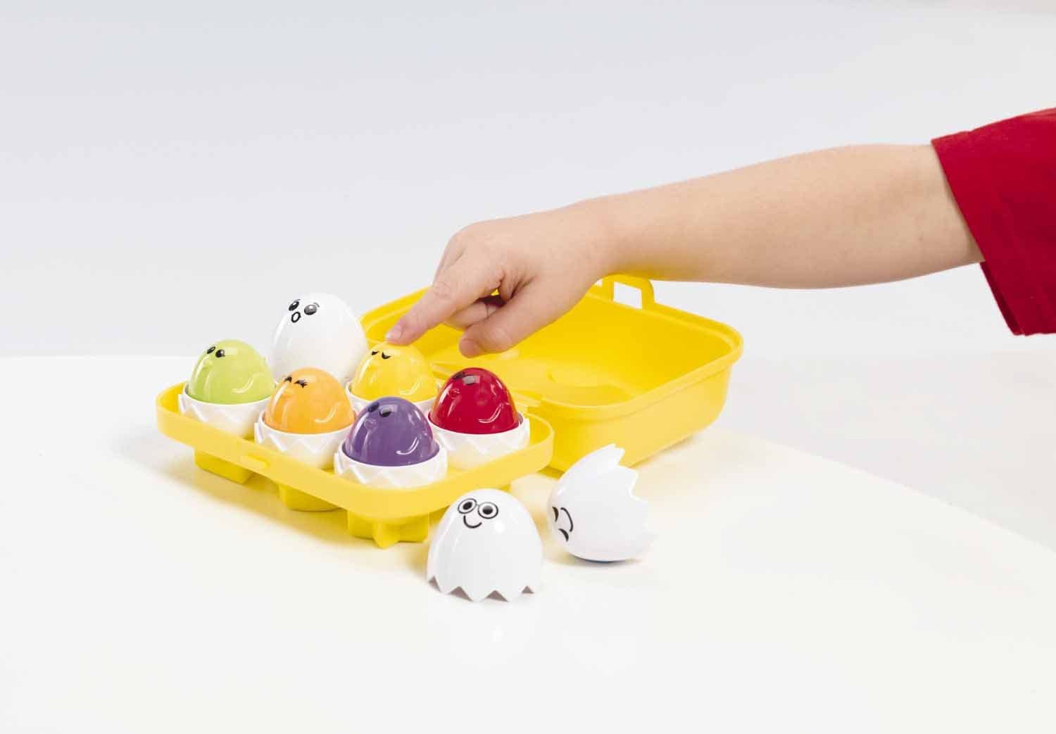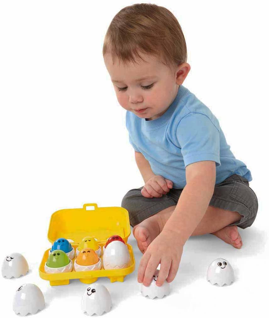 Little ones will have a ball with this toy! Lift off the eggshell to reveal a cute, colorful chick inside and press down on the chick to hear him squeak! The bottom of each egg contains a unique shape, sort the shapes to find the egg's home in the carton. For ages 12m and up.