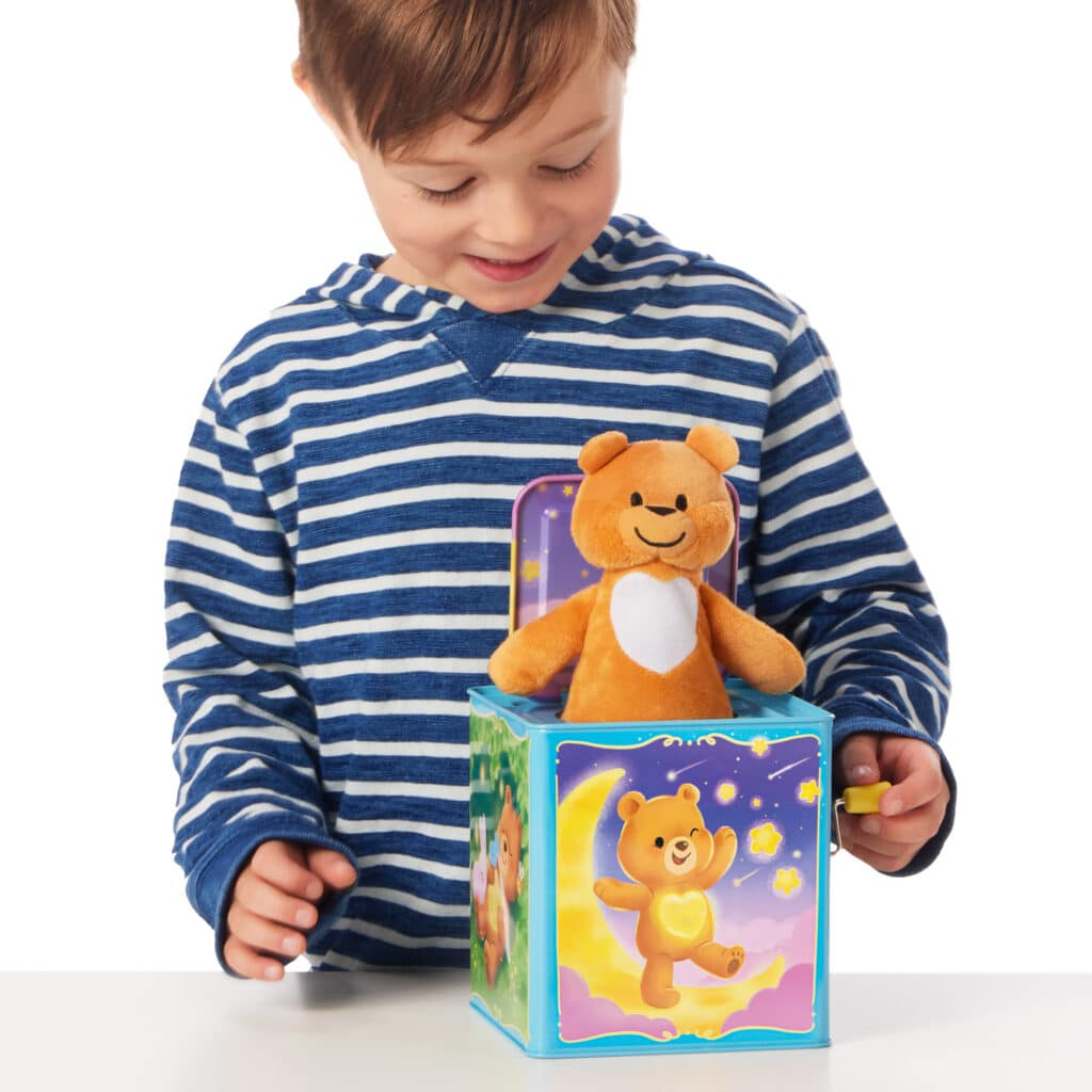 Get ready for magical fun with Schylling’s Pop & Glow Teddy Jack in the Box! Turn the handle as you listen to the magical sound of “Twinkle Twinkle Little Star” and when the teddy bear pop ups watch the light in his belly glow a soothing rainbow of colors. Push the teddy down to play again! Made with a high quality metal box that is covered in whimsical illustrations to bring Teddy’s world to life. Requires 2 AA batteries, included.