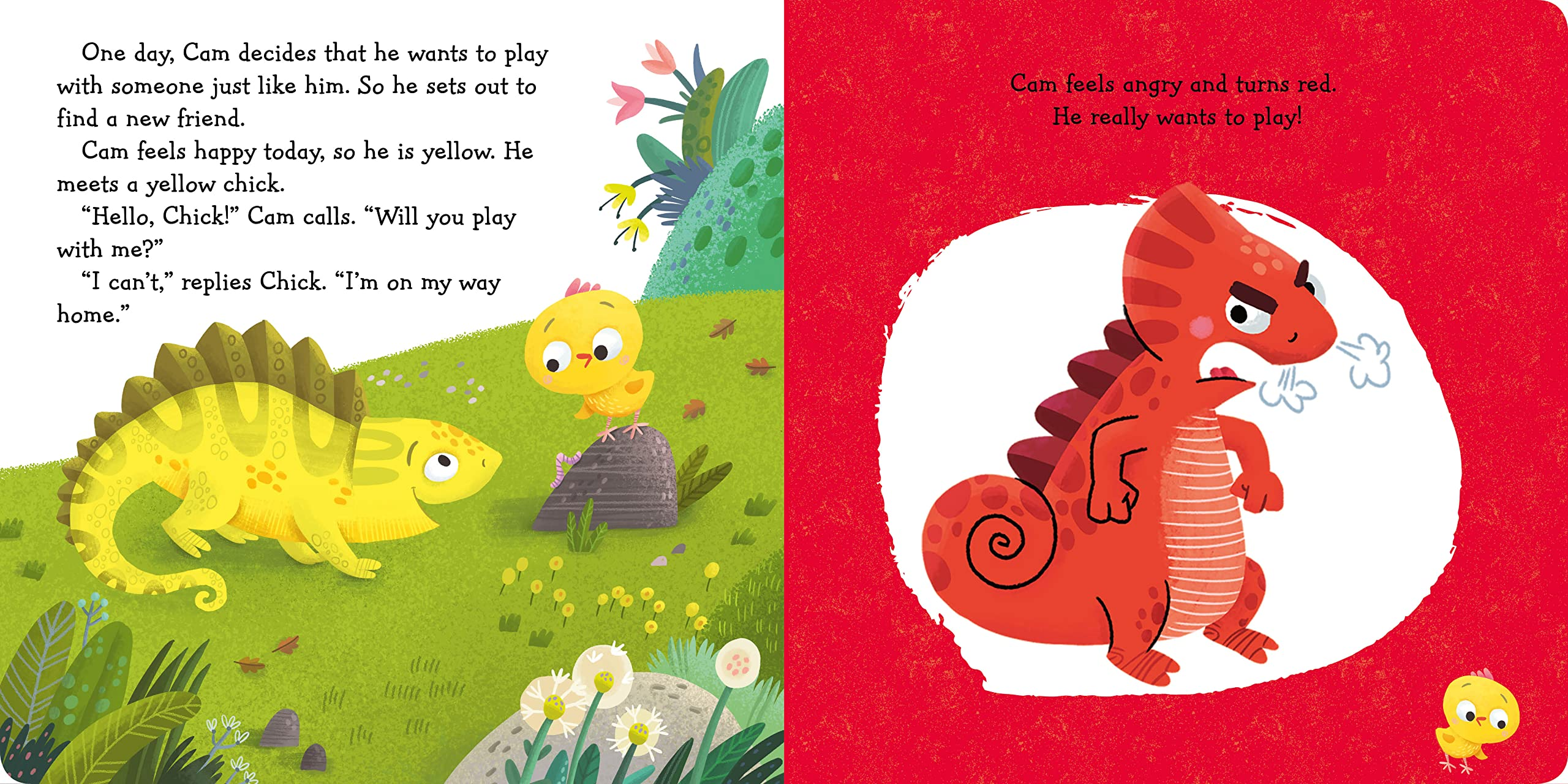 Iggy the multicolored chameleon turns different colors depending on his emotions. While visiting the animals in the jungle, he turns different colors as he feels angry, ashamed, shy, sad, and more. He sets out to find someone who looks like him, and when he meets a yellow chick, he feels happy! But then he discovers that Little Chick likes to eat worms, and that makes Iggy feel angry—and he turns red. So Iggy sets off to find a friend who is red. At the conclusion of his adventures, Iggy learns that it’s important to be himself, and that it’s okay to feel the strong emotions that he feels.