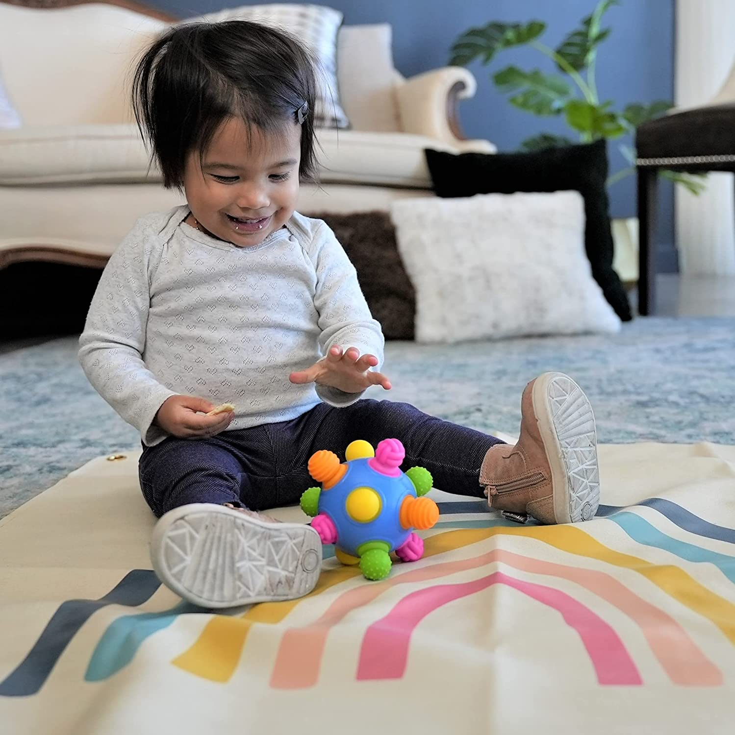 Push, pull, chew, wobble, roll and chase! Woblii is a simple, yet multi-dimension ball that is designed to grow with your childrens as they develop! Little hands will be occupied for hours once you introduce them to Woblii Sensory Ball. Recommended ages 3 months and up.