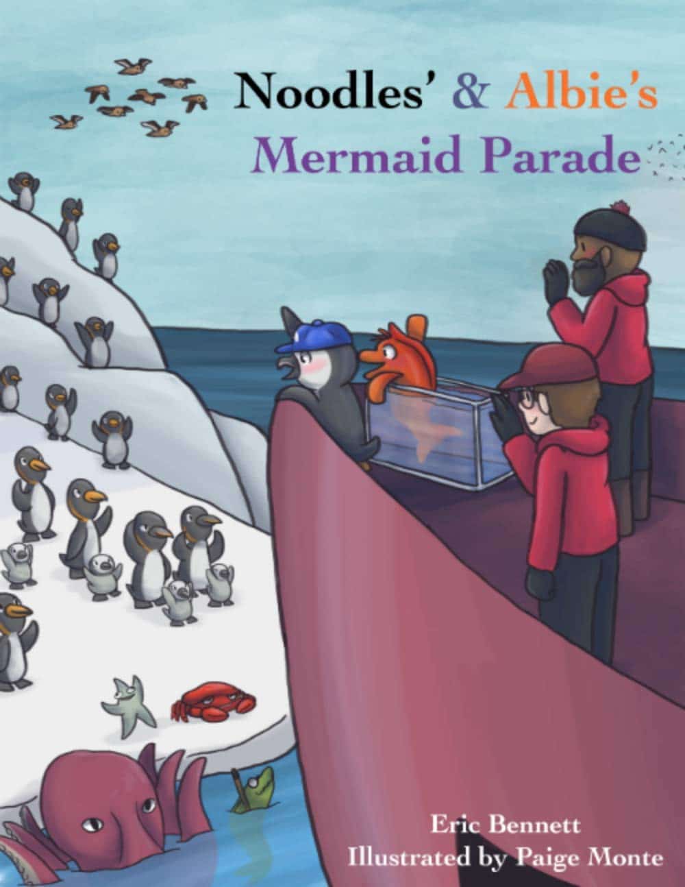 Noodles' & Albie's Mermaid Parade is the third fun penguin picture book in the N & A series. When Noodles & Albie overhear Jon & Ken (a pair of penguin researchers) on the Antarctic Ice talking about Coney Island, the amusement park and the annual Mermaid Parade the day before they set off for home and the parade, they convince Jon and Ken to take them along and they all embark on a 6000 mile sea adventure, stopping in the Falkland Islands and meeting other penguins (King Henry and Rocco Rockhopper) who join them, saving an oil tanker from grounding on rocks thereby averting a huge environmental disaster, and eventually making it to Coney Island just in time for the legendary Mermaid Parade. The book is a 32 page, 8.5" x 11" hardcover book, with 16 wonderful illustrations by Paige Monte. This book is for children between the ages of 4 and 8, and of course parents will love it too.