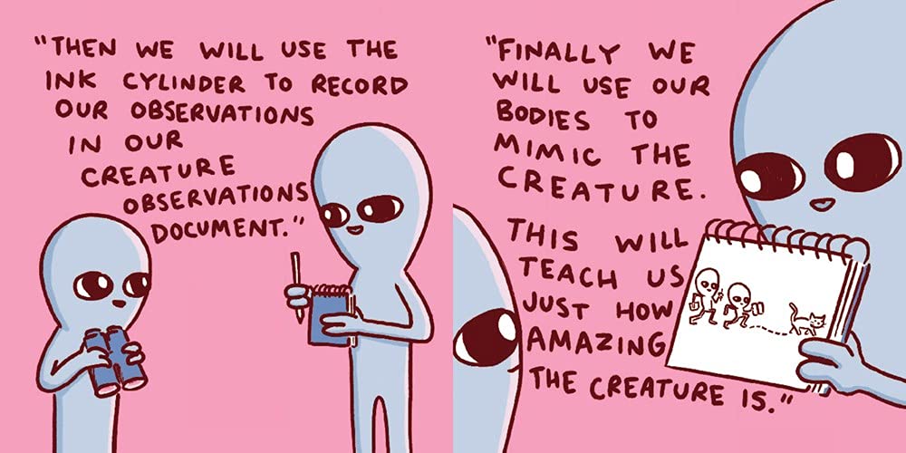 Nathan W. Pyle’s first picture book in his Strange Planet series, a #1 New York Times bestseller! Based on his popular Instagram comics, Nathan W. Pyle presents a delightful, heartfelt, and clever picture book that young and old beings alike will enjoy reading together. When the nearest star rises, Lifegiver has an exciting quest planned for Offspring! Follow along as they observe a strange creature that sneaks, hides, and vibrates around their house. Hilarity ensues as the blue beings try to mimic this talented creature. As always, Nathan W. Pyle draws humor from his unique perspective on human activity and delivers a colorful experience that is an ode to cats and humans alike. This book is a joy to read and share, no matter how many revolutions you’ve made around the nearest star.