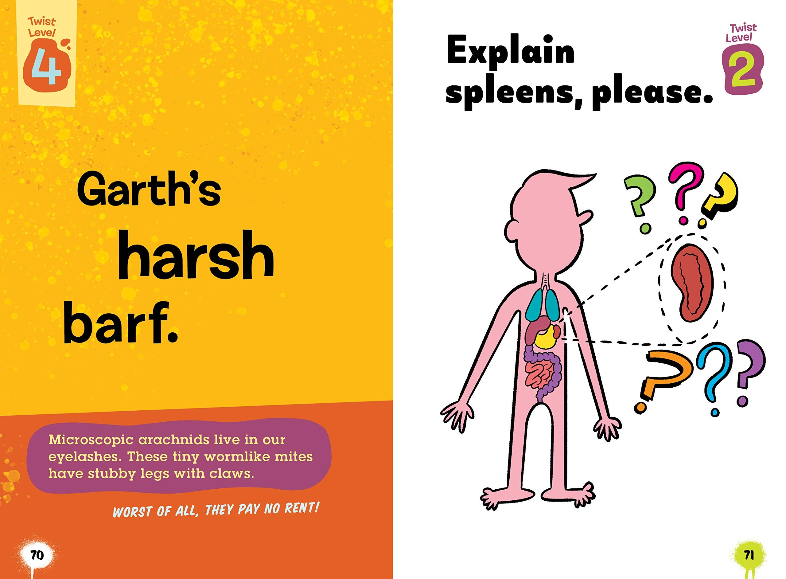 Featuring the funniest things in life––like barf, drool, mucus, pus, and gas––Twisted Tongues is an excellent collection of more than 150 tongue twisters, all sure to gross out your parents.