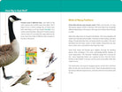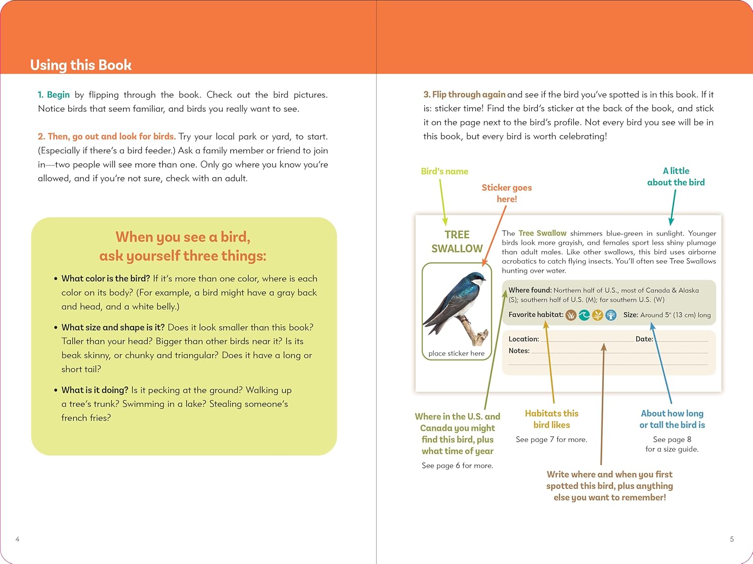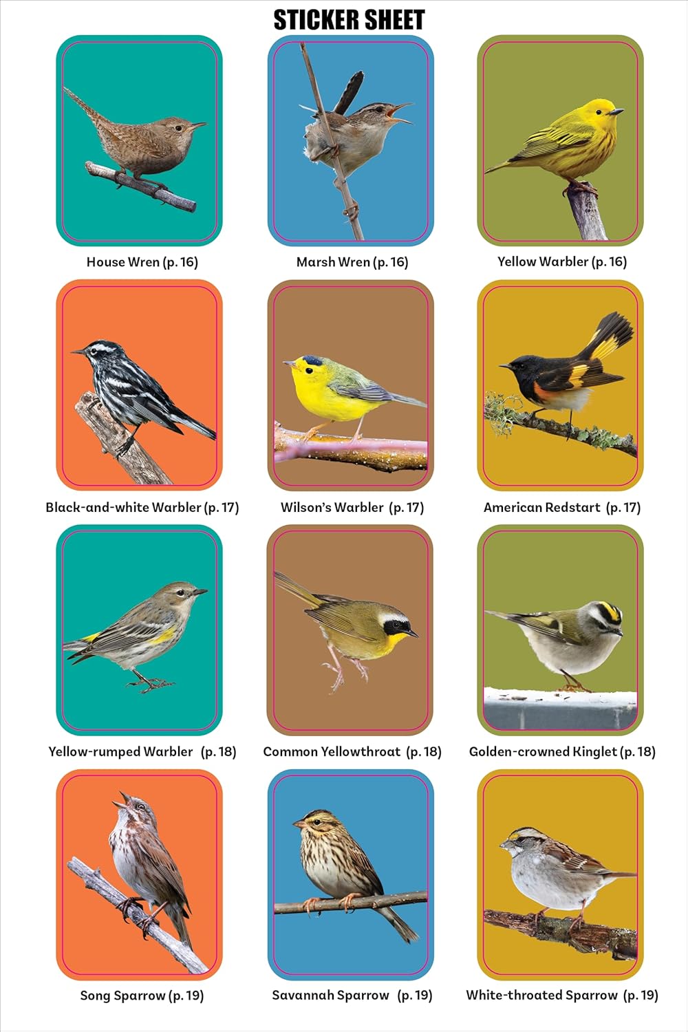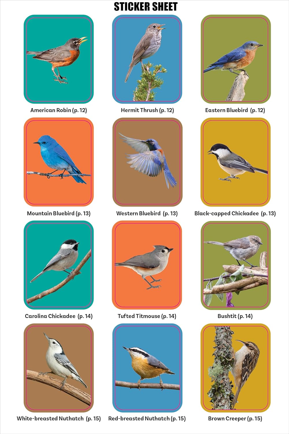 Full-color sticker book interior offers facts about each bird, general location info, and habitat hints, plus tips for new birders.