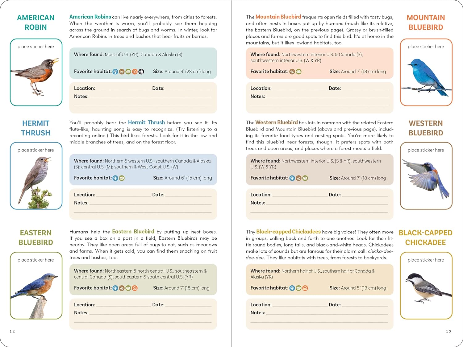 Each time a young birder sees one of the species, whether in a park, on a walk, on vacation, or in their backyard, they can place its sticker beside its profile in the book.