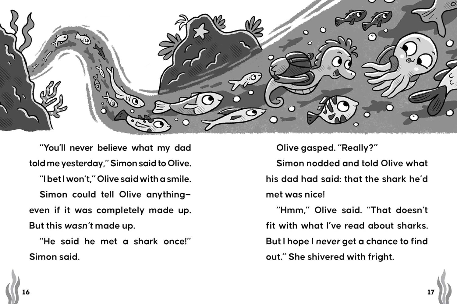 Simon and Olive love playing “I Spy” in Coral Jungle because there are so many things to see! There are different types of coral, seagrass, and all sorts of fish. But one day they spy…a shark! They swim away as fast as they can, but the shark catches up to them and introduces herself. And it turns out Simon and Olive—and all of Coral Grove—have a lot to learn about sharks.
