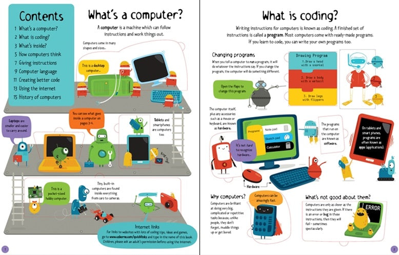 An interactive introduction to information and communication technology, which explains what goes on inside computers to make them do what they do. With lots of flaps to lift and look beneath, fact-hungry children will devour the fascinating data contained in this bright and engaging non-fiction book. A return to the days when Usborne was a market-leader in computer books for children. Many of today's tech professionals were inspired by Usborne's coding books from the 1980s.