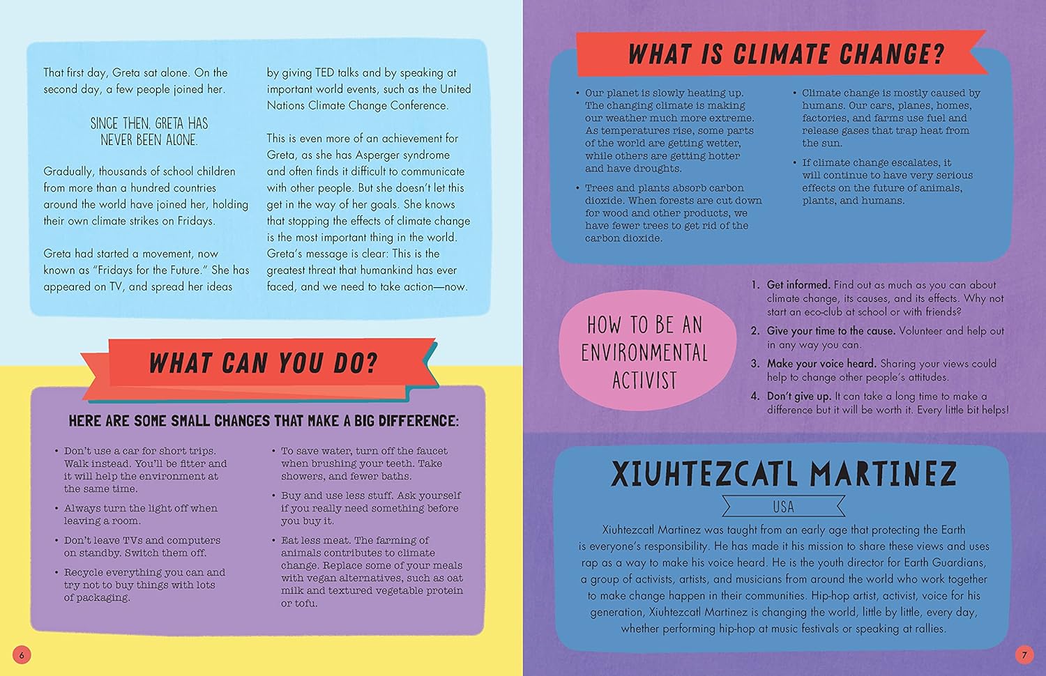Rise Up: Ordinary Kids in Extraordinary Stories features 29 tales of amazing young girls and boys who have achieved the unimaginable. The stories range from triumphing over illness and injury to overcoming bullying. Entries include Sweden's Greta Thunberg, whose youth climate activism sparked a global movement, and Pakistan's Ayesha Farooq, who became Pakistan's first female fighter pilot at age 25.
