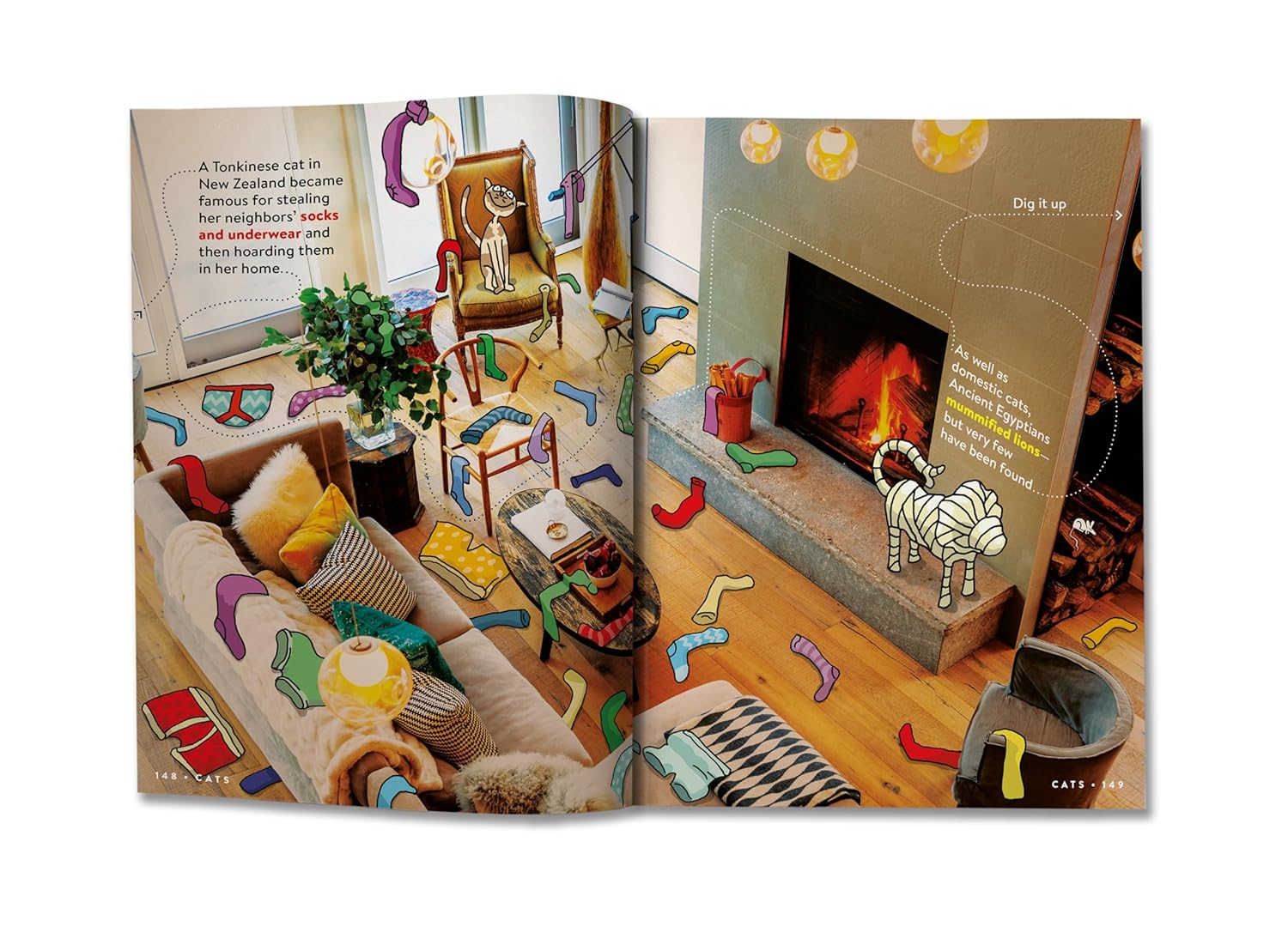 You’ll meet an underwear-stealing cat, find out about sharks that glow, uncover a toilet in disguise, and learn about the biggest ever game of hide-and-seek. And the facts aren’t the only secrets in this book, for hidden among the illustrations are ten mice just waiting to be found!