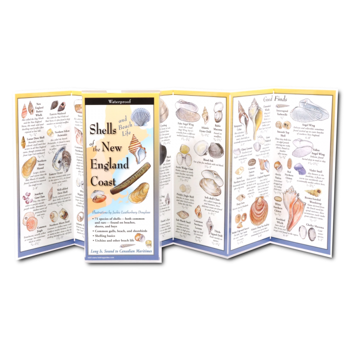 77 shell species, both common and exotic, found on the Atlantic Coast from Long Island Sound up to the Canadian Maritimes. Illustrations by Jackie Leatherbury Douglass. Includes info on how to clean and preserve shells Includes common gulls, shorebirds, and beach life Indestructible lamination – water and beachproof Instant access to just what you need to know
