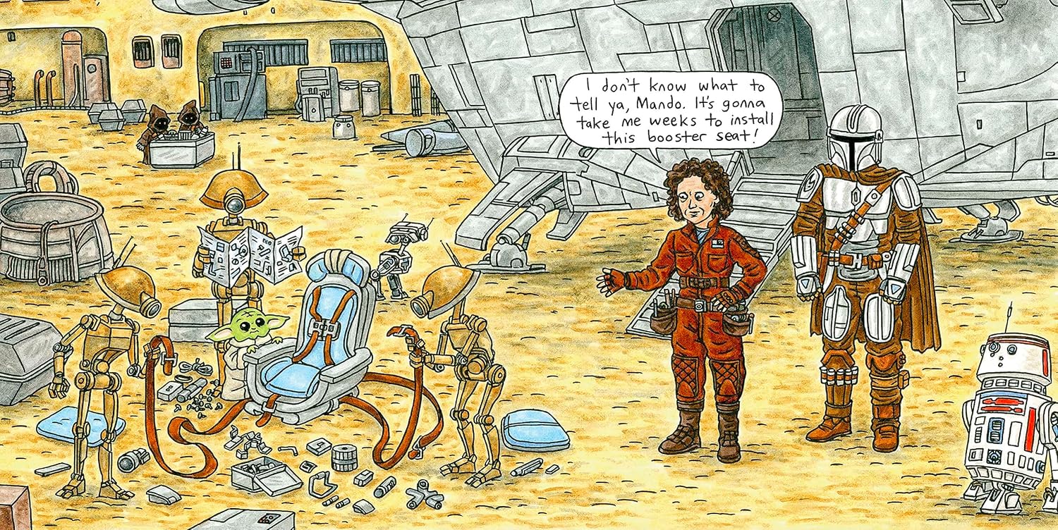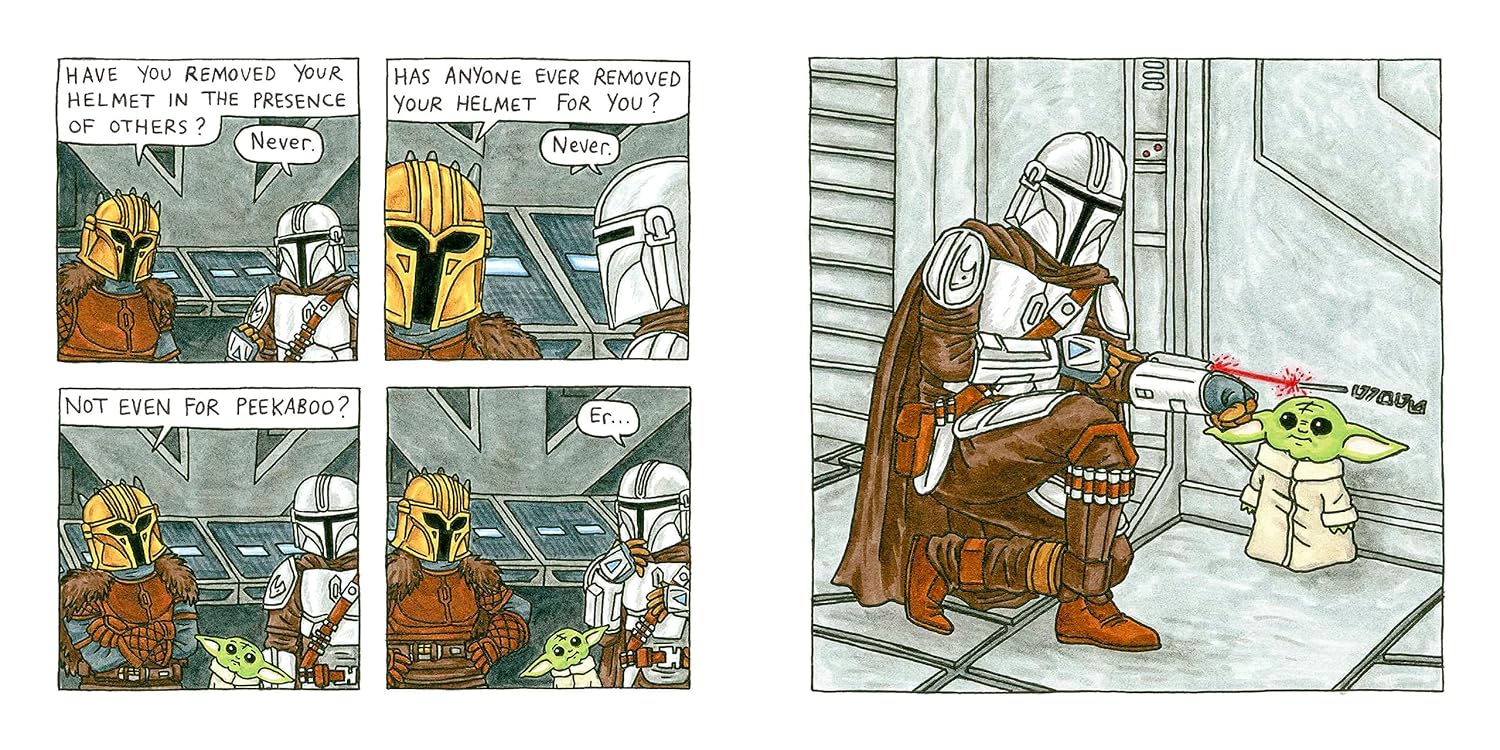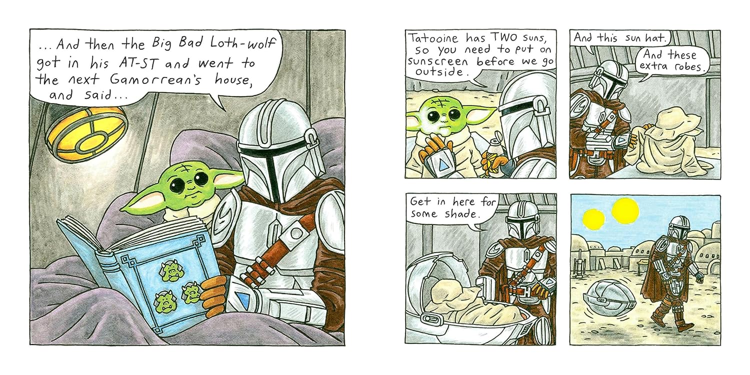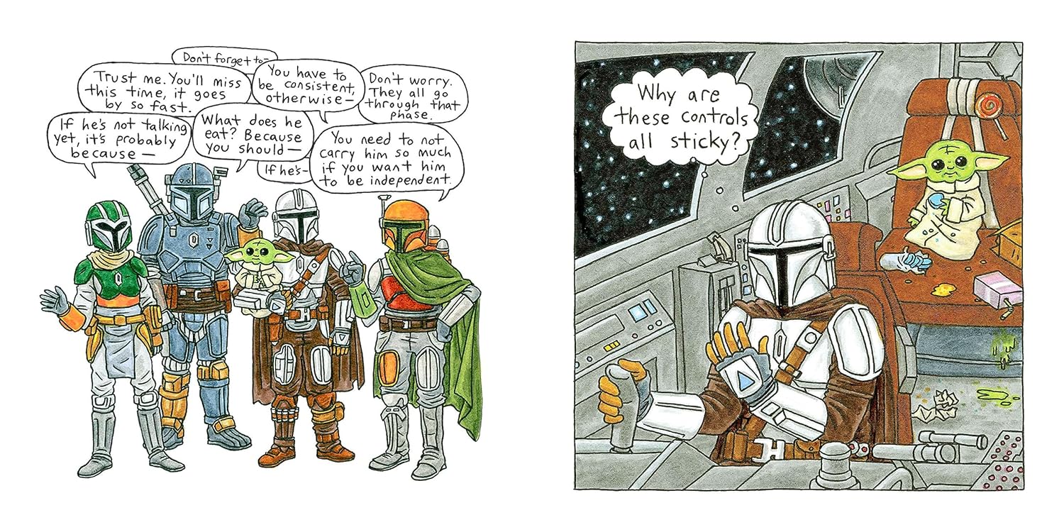 Brown’s colorful all-ages style and spin complement the show’s gritty milieu while accentuating the sweetness of the found family at the heart of the story. His unexpectedly funny touches and twists, and lighthearted interpretations of favorite characters, including Bo-Katan, Moff Gideon, The Armorer, Luke Skywalker, Ahsoka Tano, IG-11, Peli Motto, and many more, will thrill fans and give them a way to appreciate all three seasons of the show in a whole new way.
