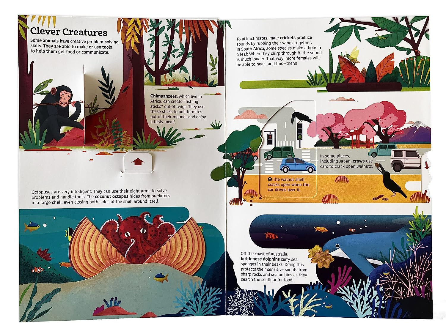 Interactive and engaging, Ultimate Spotlight: Extraordinary Animals gives children a look at the incredible skills of animals. Discover their abilities: Pull a tab to observe how an octopus hides in a large shell, turn a wheel to marvel at the ballet-like gathering of starlings, and lift a flap to reveal the chimpanzee's secret trick to catching ants.