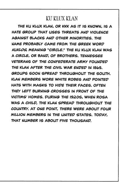 In 1955, Rosa Parks refused to give her bus seat to a white passenger in Montgomery, Alabama. This seemingly small act triggered civil rights protests across America and earned Rosa Parks the title "Mother of the Civil Rights Movement." This biography has black-and-white illustrations throughout.