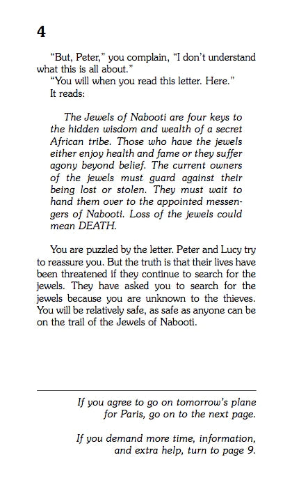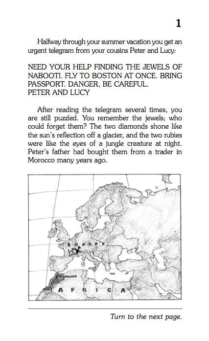 The elusive and mysterious Jewels of Nabooti have gone missing and your cousins Peter and Lucy are in danger because of it. Strange cab rides, meetings with dangerous strangers, and a possible plane hijacking lie ahead. And that’s just the beginning…can you make it to the end, unscathed?