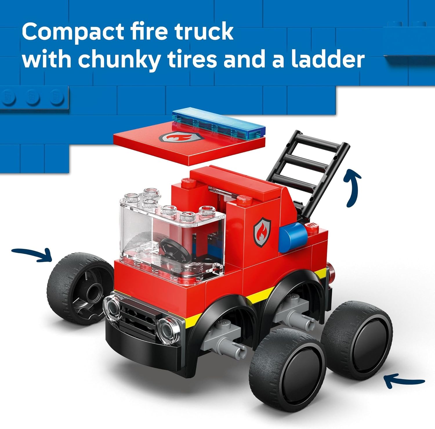 Young heroes can ride out on daring rescue missions with the LEGO City Rides – Fire Truck (60482) building toy for kids ages 5 years old and up. This compact toy truck playset is a great introduction to the creative world of LEGO City and is packed with features kids will love, including chunky rubber tires and a raisable fire ladder. A LEGO City Rides firefighter junior minifigure is included and fits perfectly in the driver's cab, offering young builders a fun way to explore public safety roles through creative play. This easy-to-build fire truck toy playset is part of the LEGO City Rides range and can be combined with other sets (each sold separately) for more adventures. Makes a wonderful birthday surprise or anytime treat for boys and girls who enjoy storytelling and pretend play. For even more building fun, parents can help kids access the LEGO Builder app, where they can use 3D tools to zoom and rotate their sets, access instructions, and save and track progress. Contains 67 pieces.