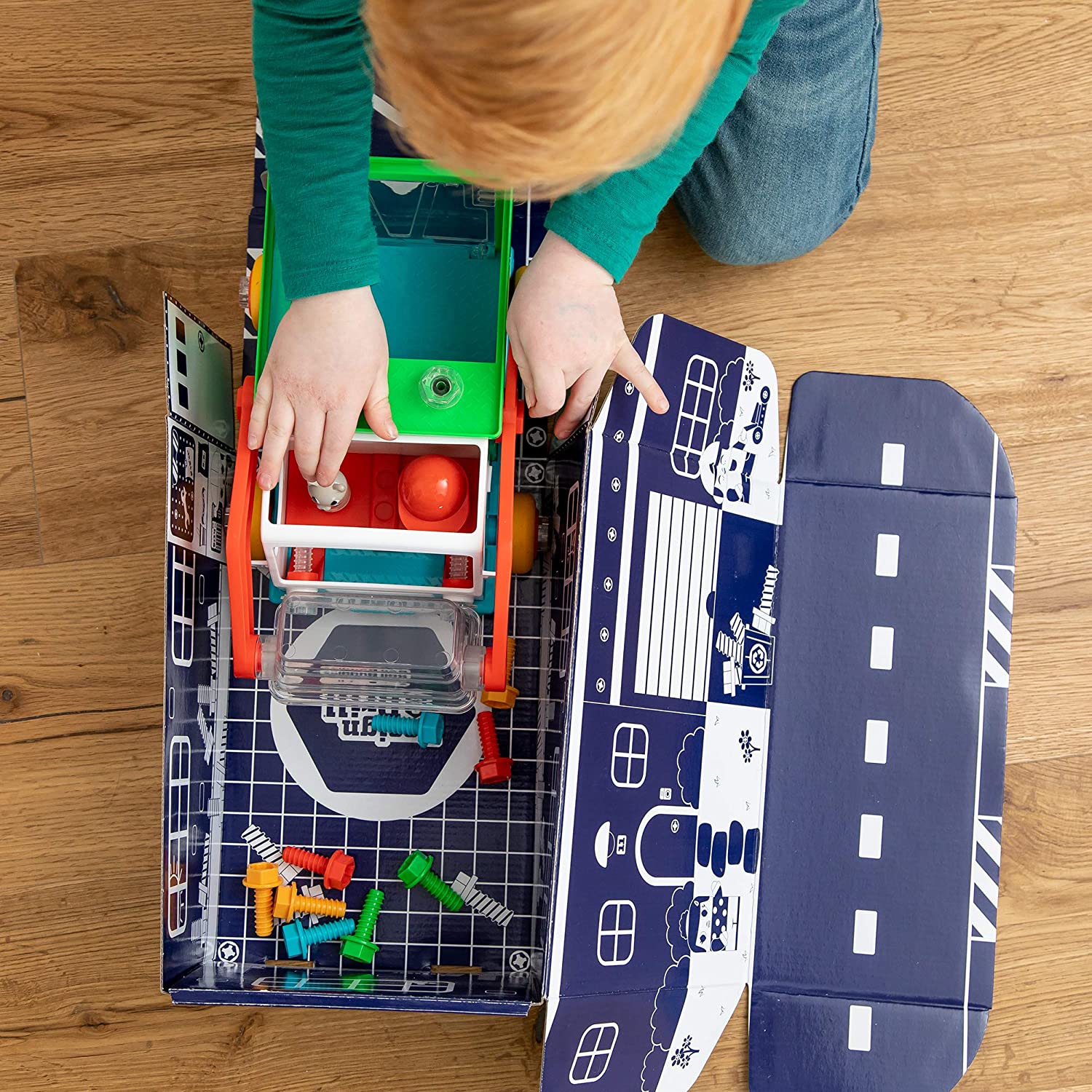 With so many ways to build and play, the Design & Drill Bolt Buddies will keep your little builder busy, busy, busy! Kids use the kid-safe drill to build the Pick-it-Up Truck, drop the Bolt Buddy driver and his kitty-cat co-pilot into the driver’s seat for some pretend-play fun, then use the drill to activate the lift arm and to pick up bolts and drop them into the truck bed. Imagination meets construction play with this scoop-action truck with 4 drillable wheels, kid-friendly power drill, 18 bolts, and two Bolt Buddy figures. Drill requires 3 AAA batteries.