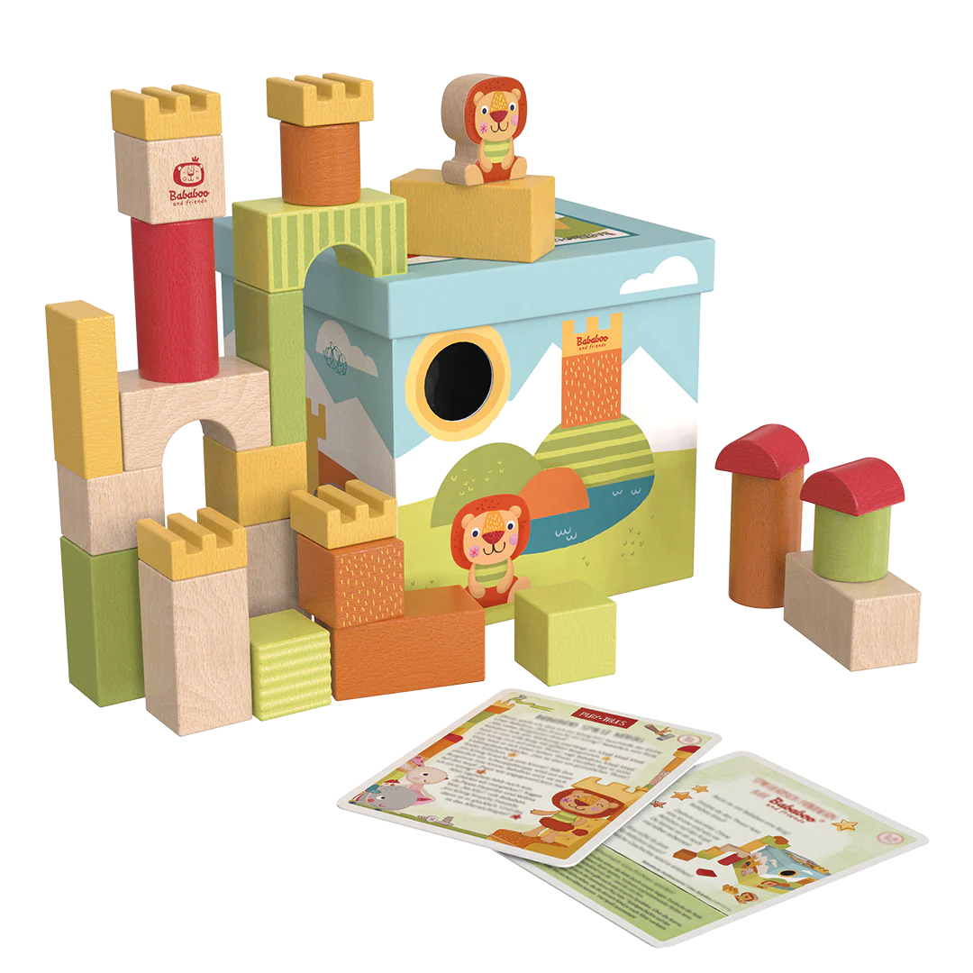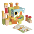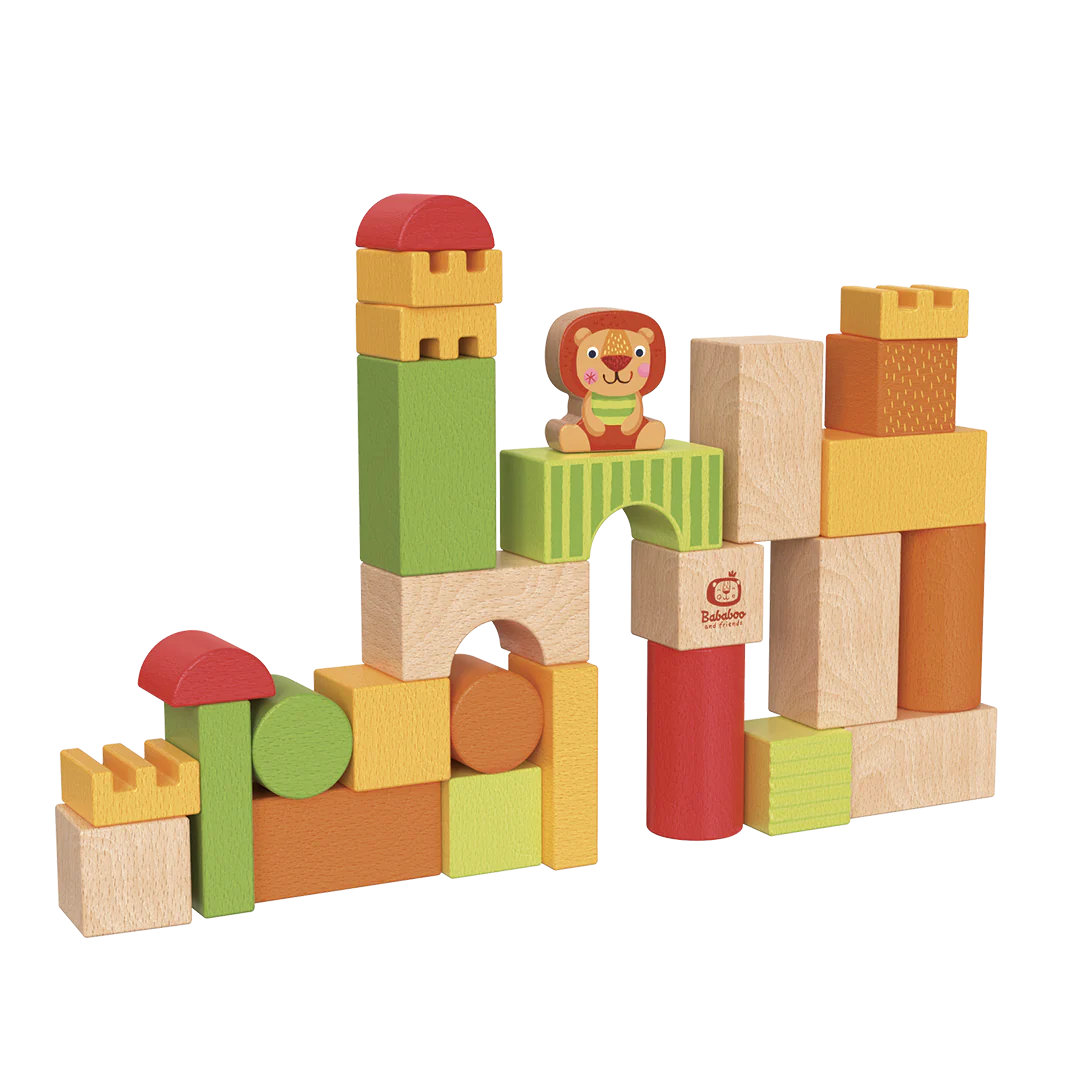 The colorful Babablocks Set "Lion Bababoo" contains numerous geometric shapes so children can build a wide variety of creative structures. One block has grooved edges which make it more challenging for children to assemble the building blocks. The 26 blocks and a little lion figure add a lively character to the building set. The various shapes, colors and design possibilities stimulate creativity, spark the imagination, and develop motor skills and coordination.