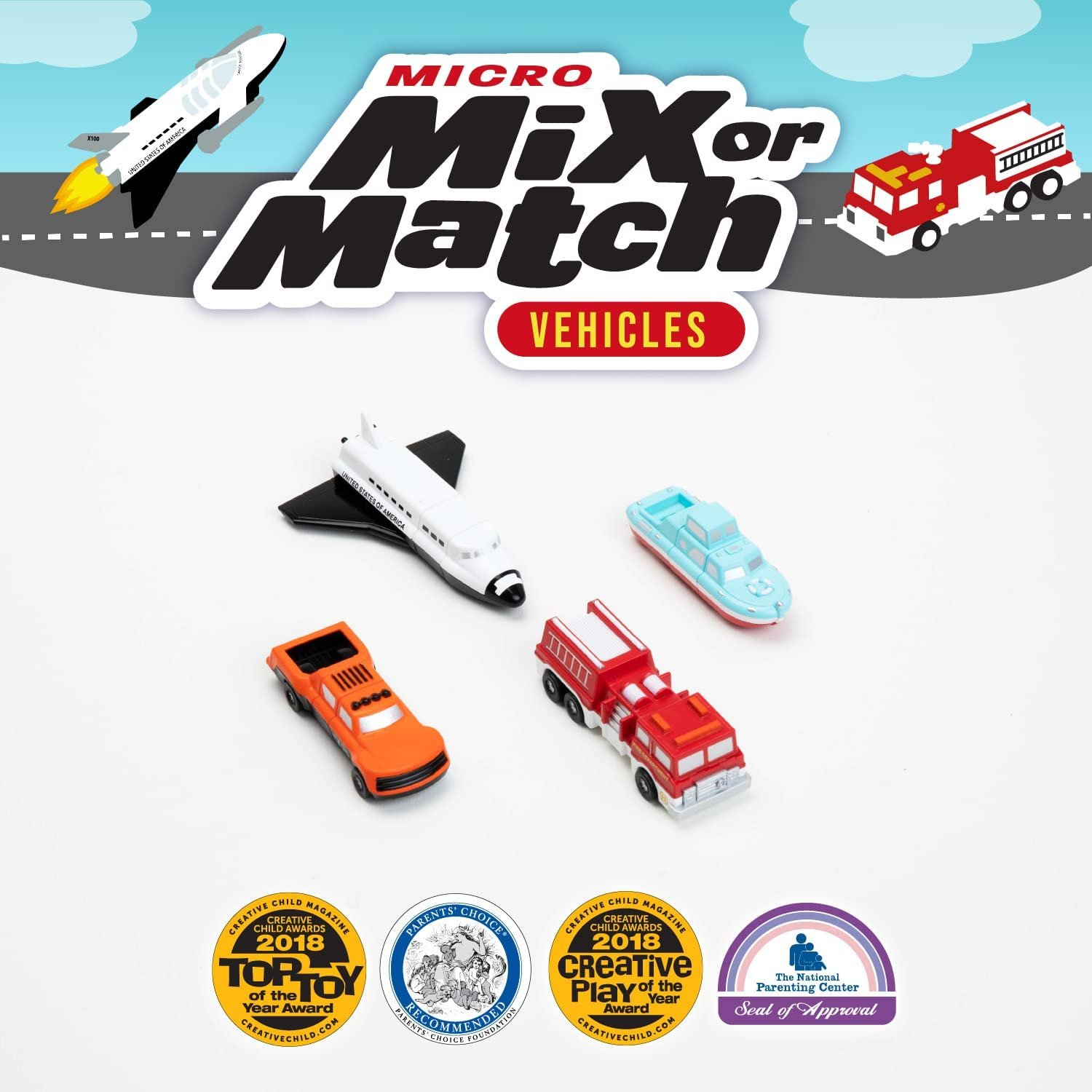 Even the smallest of toys can fuel one’s imagination. This 9 piece set of MICRO Mix or Match Vehicles allows you to build three familiar vehicles, or to mix up the pieces and build three vehicles you’ll never see on a road! Each pocket-sized 3-piece vehicle is 2.5 to 3.5 inches long and together can be combined 1000’s of different ways! Ever see a vehicle that can hall dirt to the moon and return home for a safe water landing? If you can think it, you can build it with MICRO Mix or Match Vehicles!
