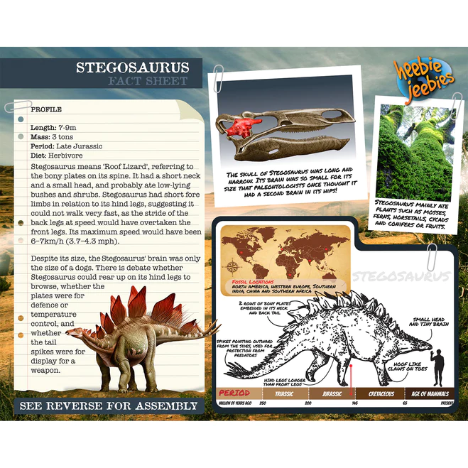 Did you know? Stegosaurus means 'Roof Lizard'! Stegosaurus have been found in North America and Europe. Stegosaurus lived in the Late Jurassic period, was 10m long and weighed 5 tons.