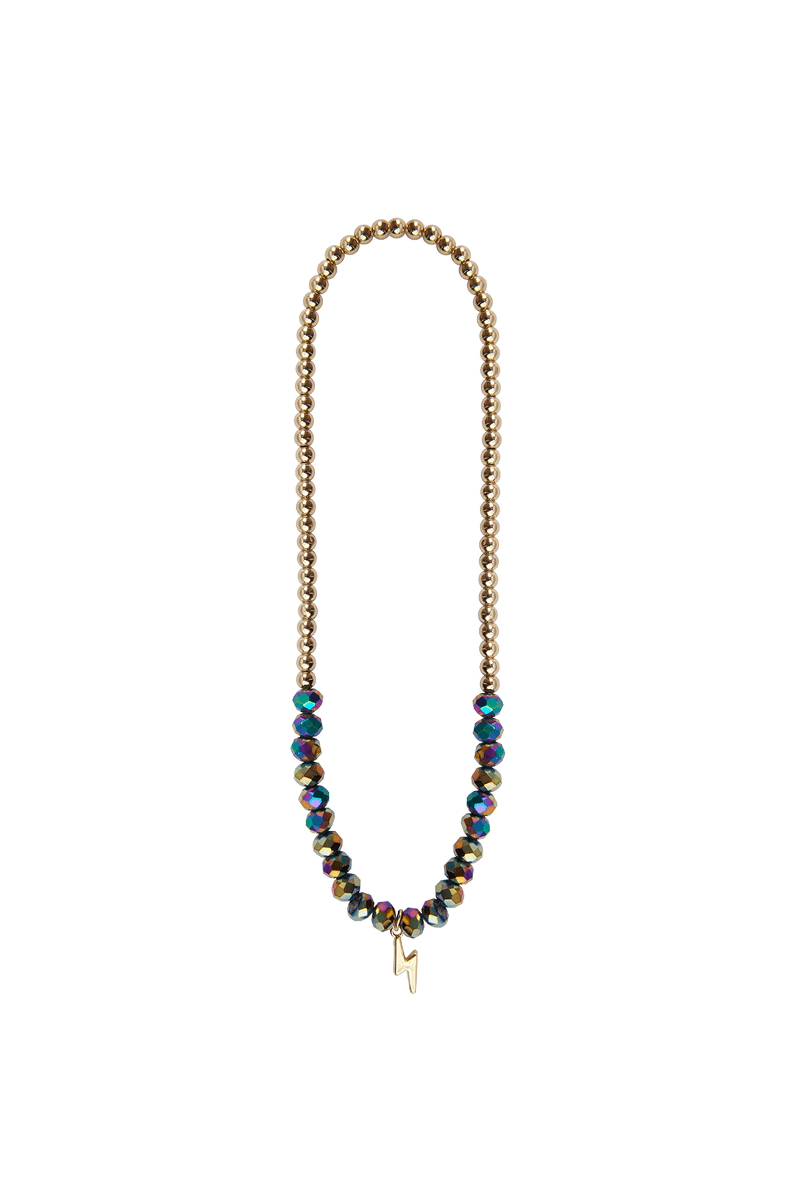 ZZZAP! Our Lightning Bolt Revolt Necklace holds a dark holographic pattern, gold beads and a gold lightning bolt charm, and looks especially cute with our matching Lightning Bolt Revolt Bracelet.