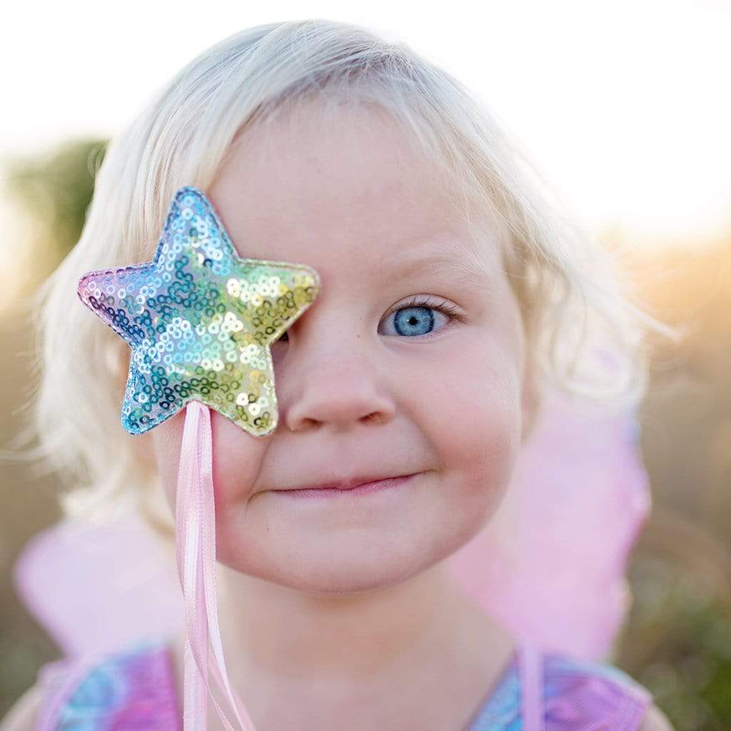 Enjoy all the sparkly fun without any shedding glitter! Our Rainbow Sequins Skirt is made with a holographic mesh & designed with no loose glitter. The wings are covered in rainbow sequins & lined with pink satin fabric. This set is completed with a matching plush sequin wand!